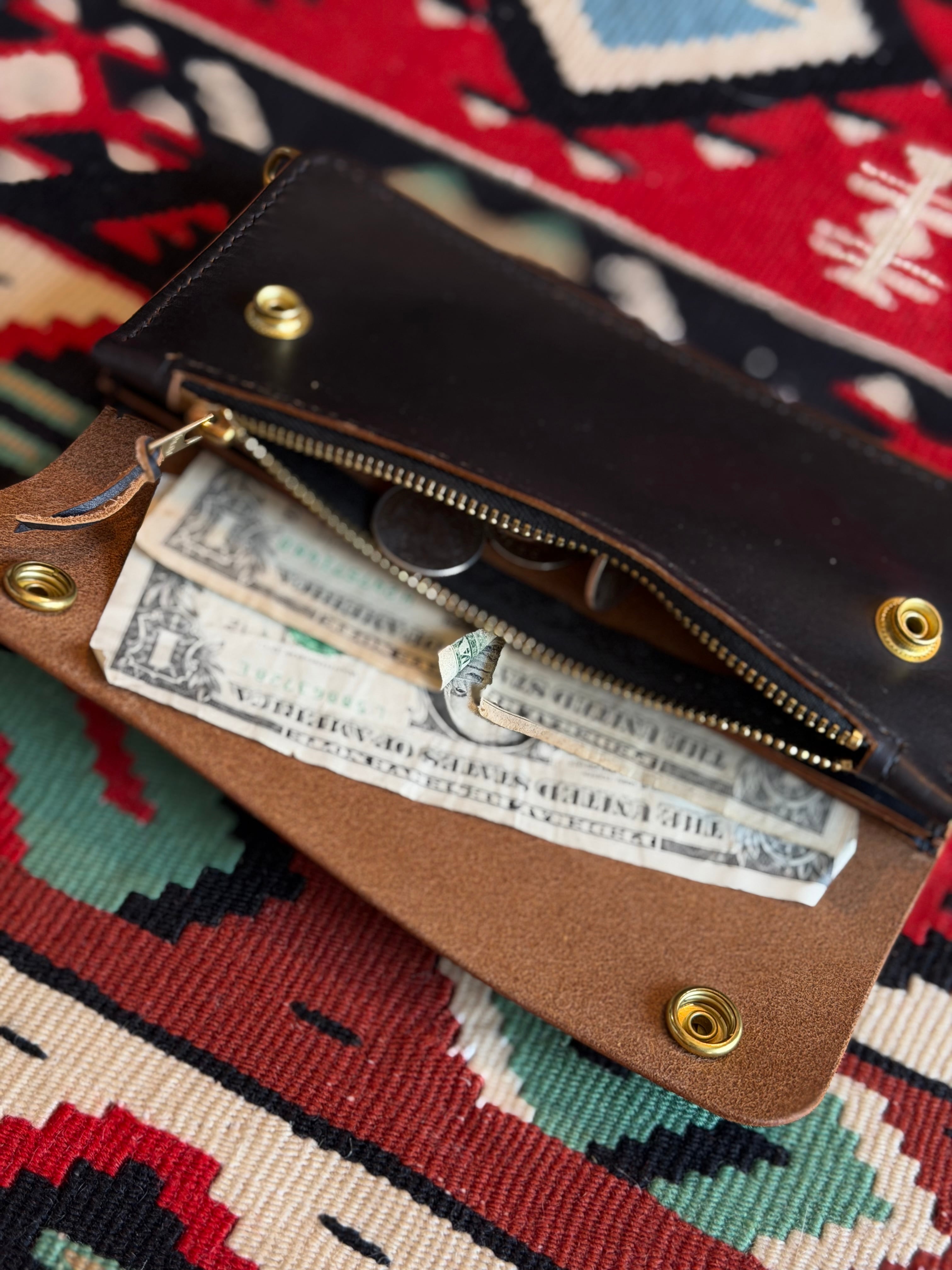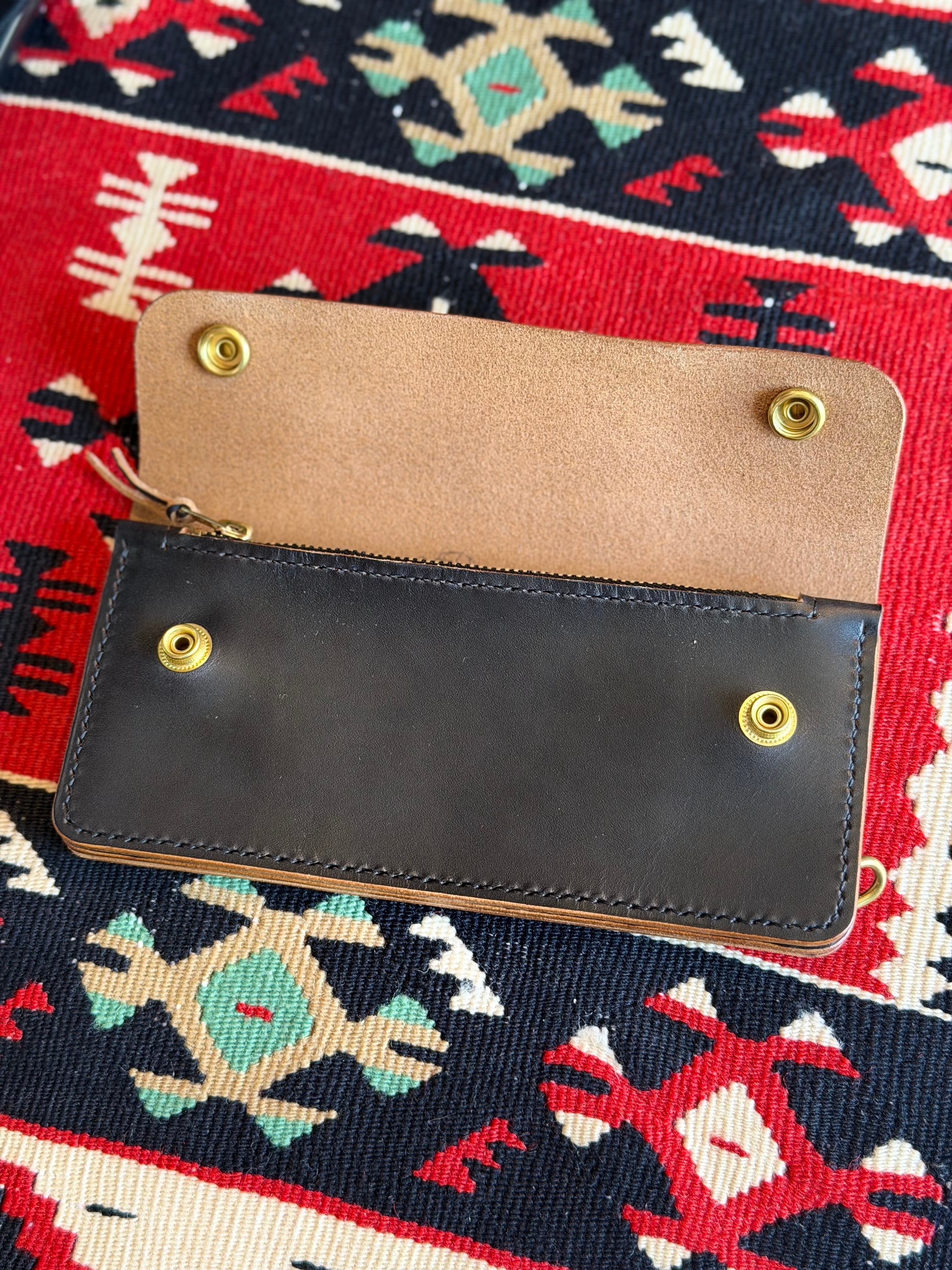 茶芯で、良い意味でチープな、薄くてペラい、ポケットへの収まりが良い、バイカーの事を考えて製作されたロングトラッカーウォレットになります。
