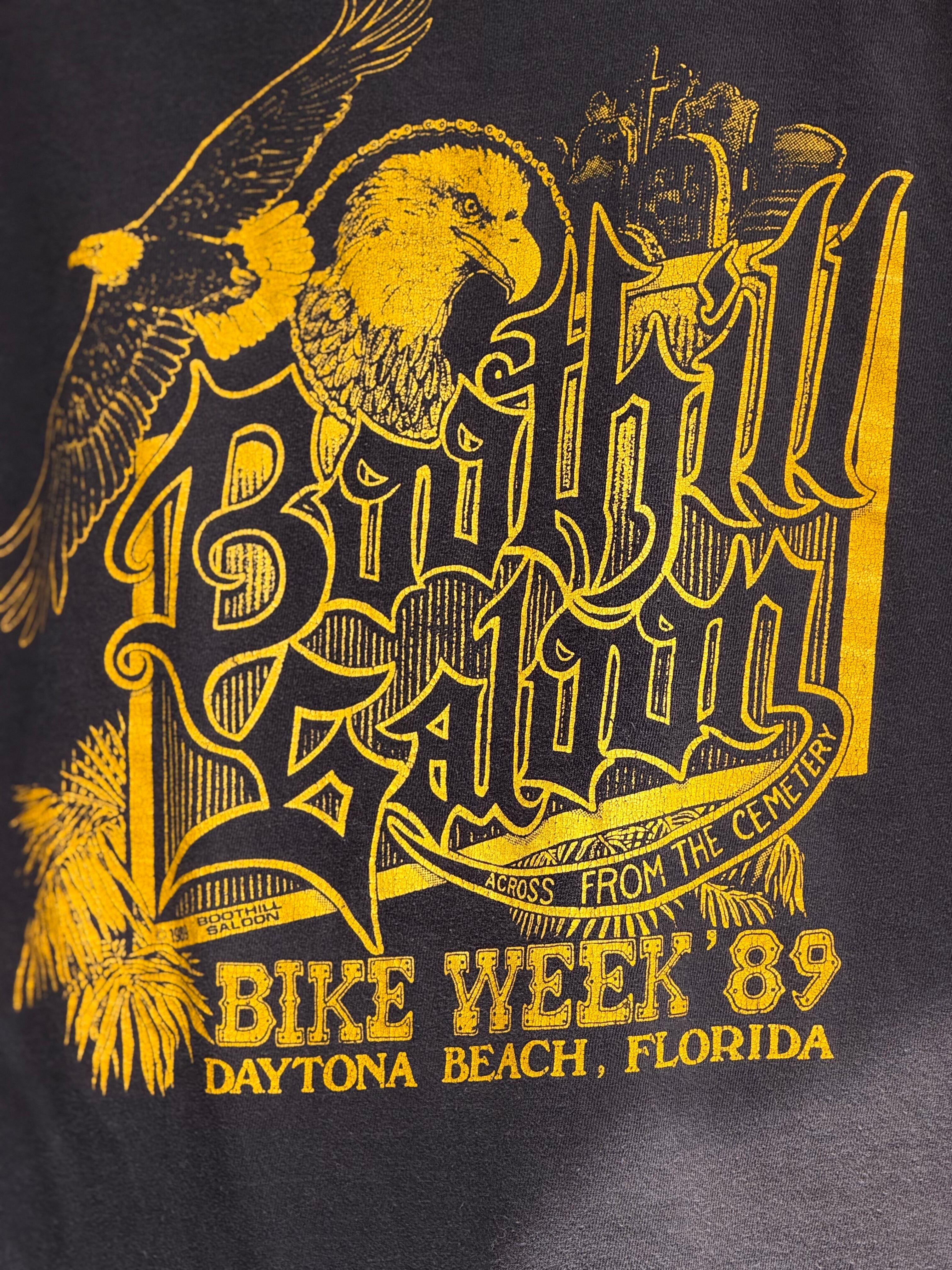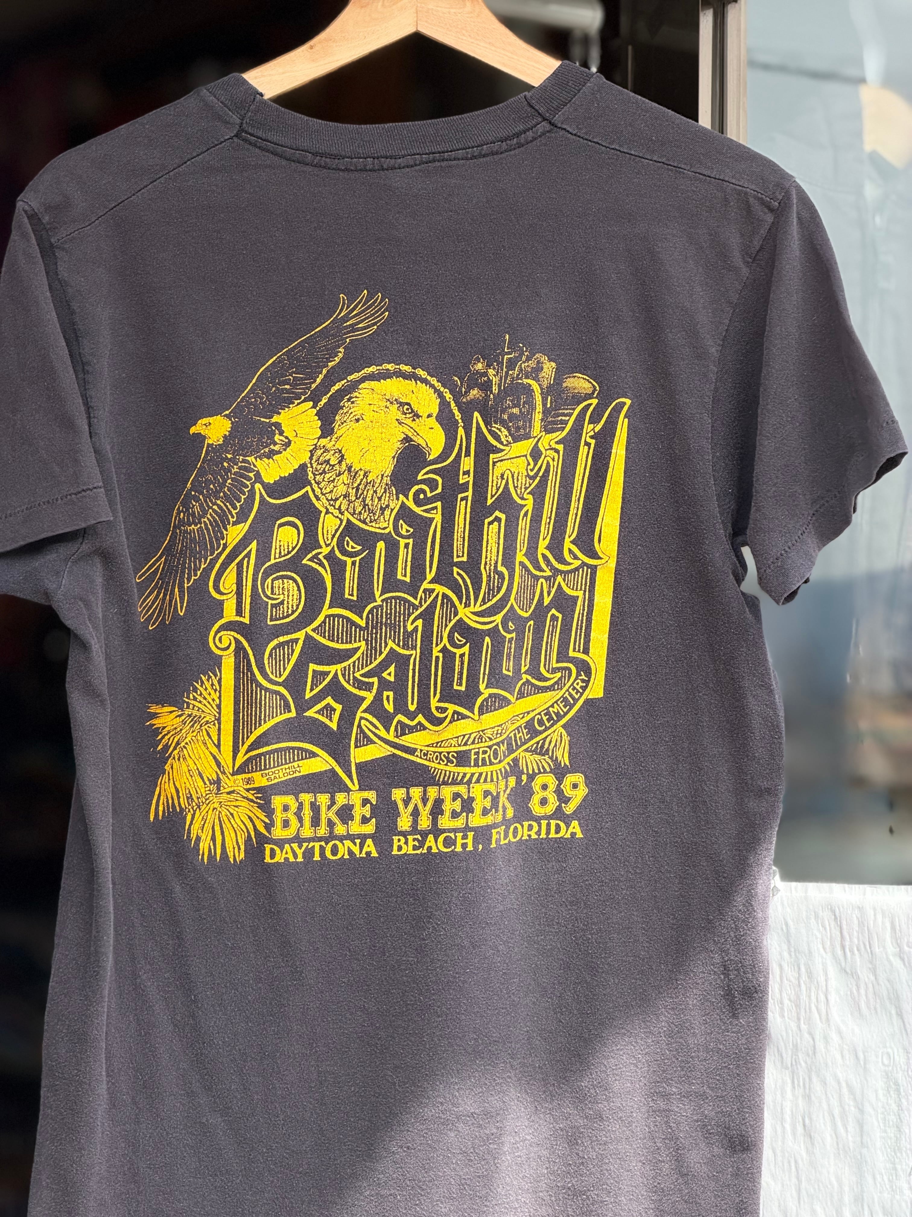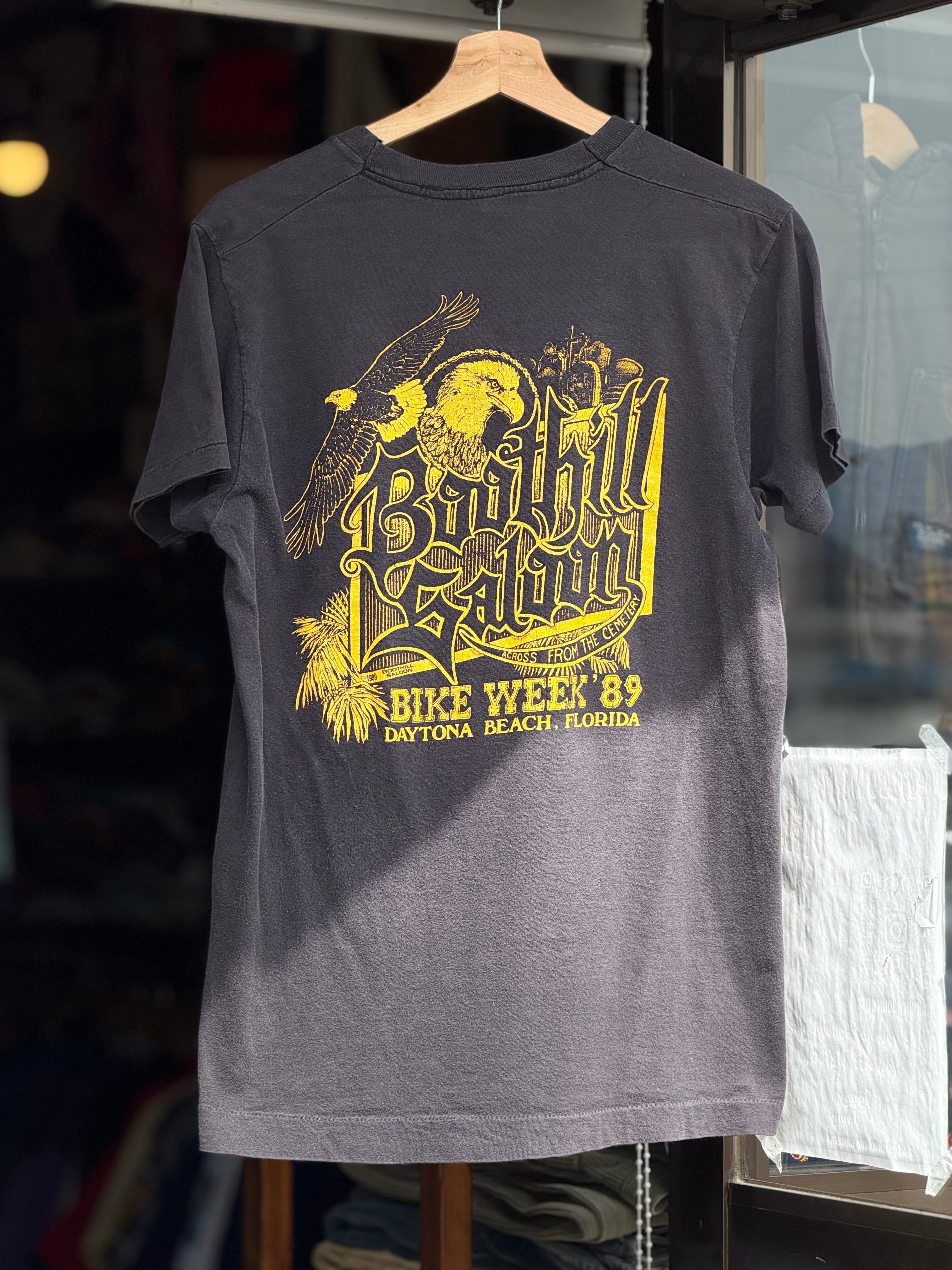 80's BOOTHILL SALOON "1989 BIKE WEEK" ポケット付き半袖Tシャツ MADE IN U.S.A. ブートヒル・サルーン DAYTONA BEACH DAYTONA BIKE WEEK バイク バイカー ポケT ポケットTシャツ イーグル フェード スミクロ 褪色 アメカジ 墓地 バイカーT