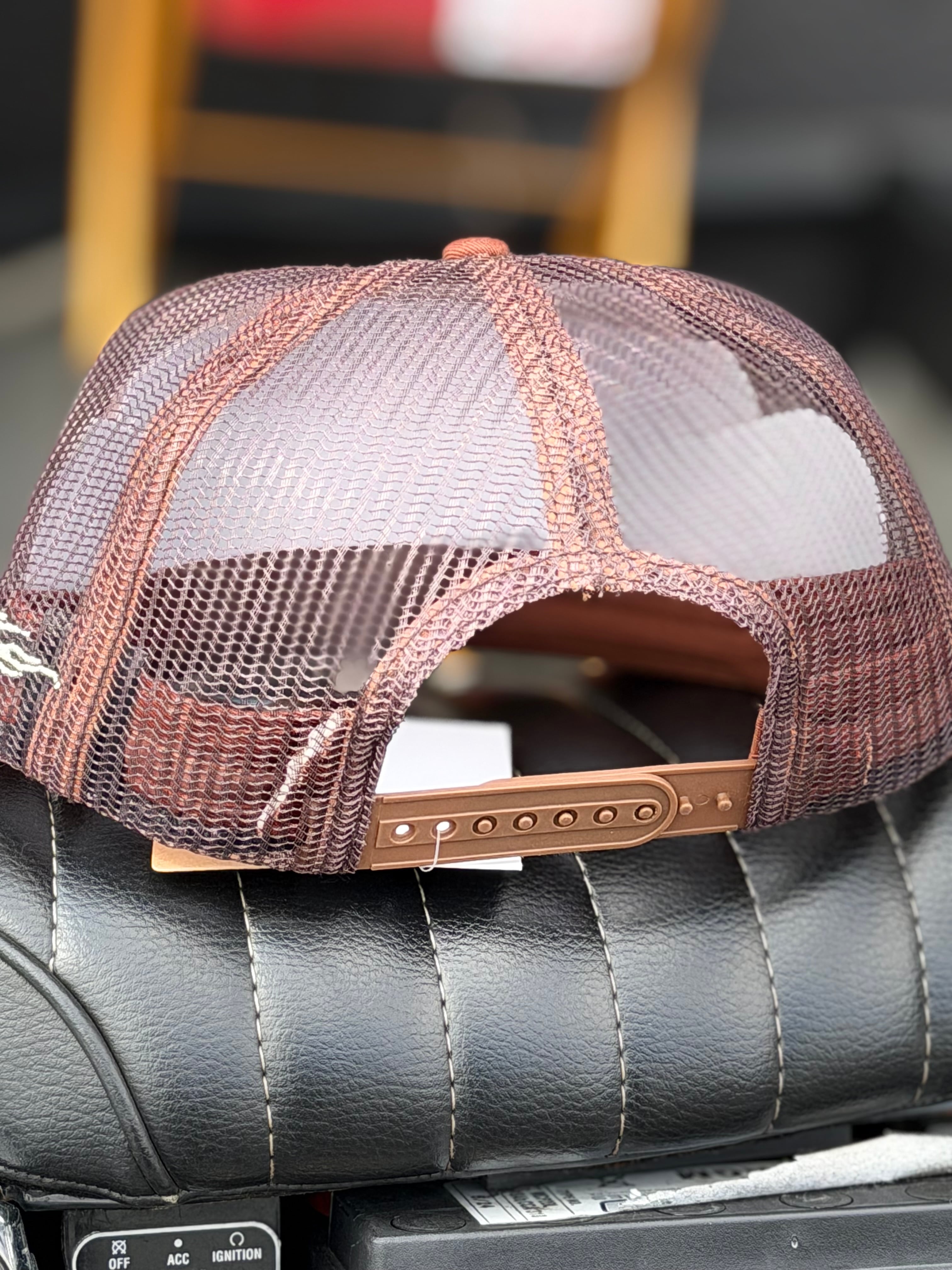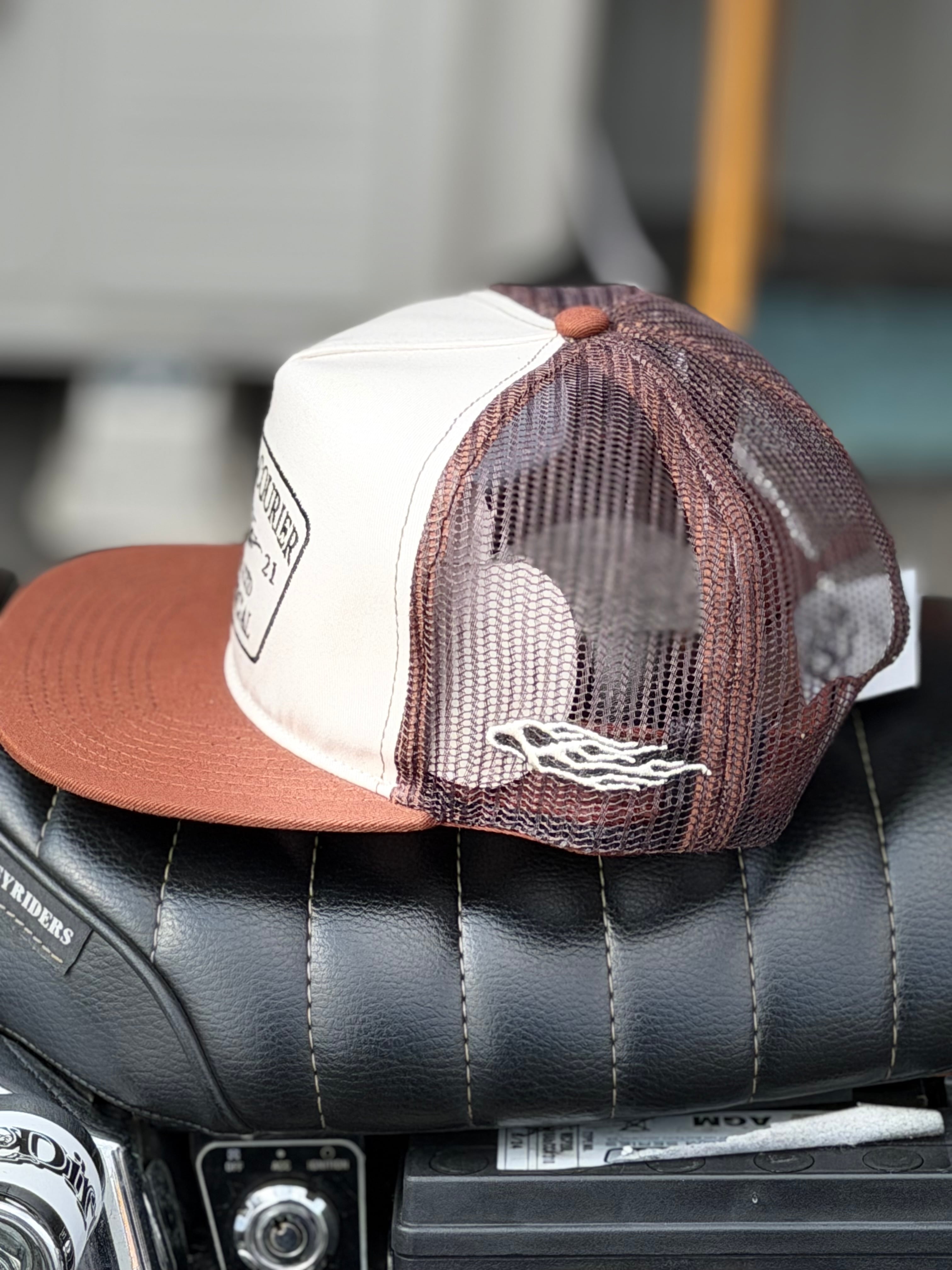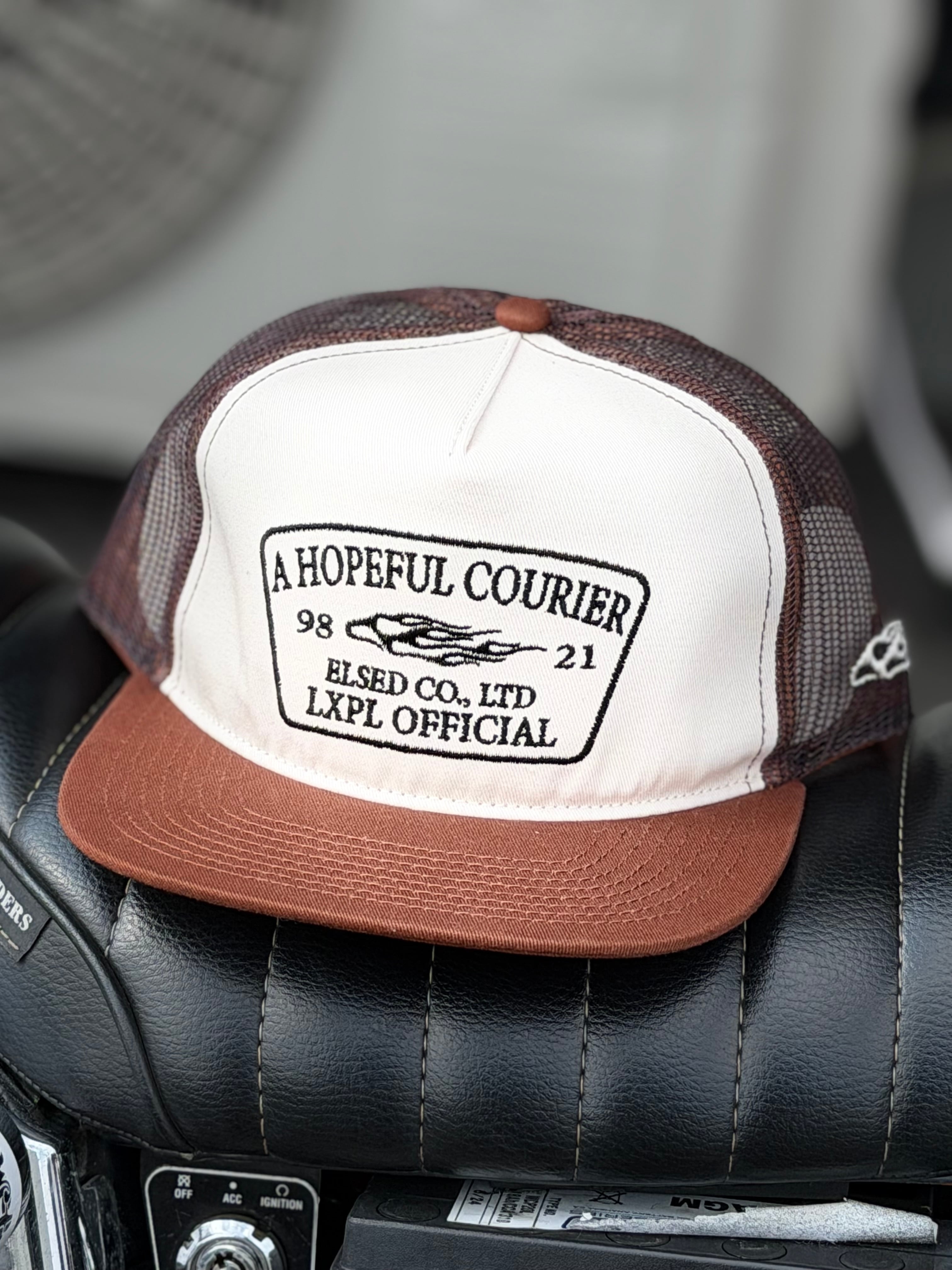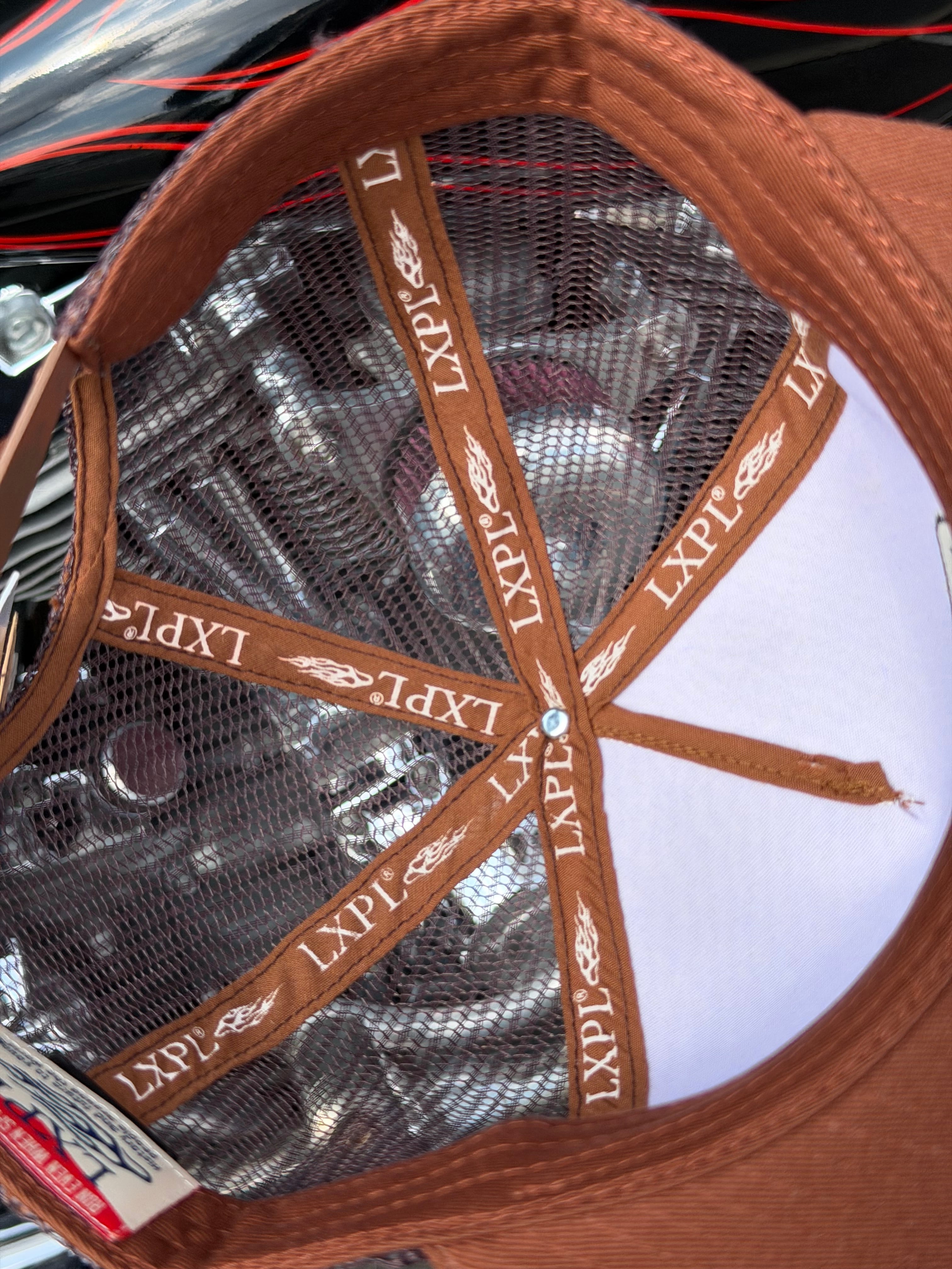 "LXPL" メッシュトラッカーキャップ LE ブラウン フリーサイズ 深め フレイムス ロゴ スナップバック フレイムス ファイヤーパターン アメカジ バイカーファッション ヴィンテージ trucker cap メッシュキャップ 夏 mesh cap 茶色