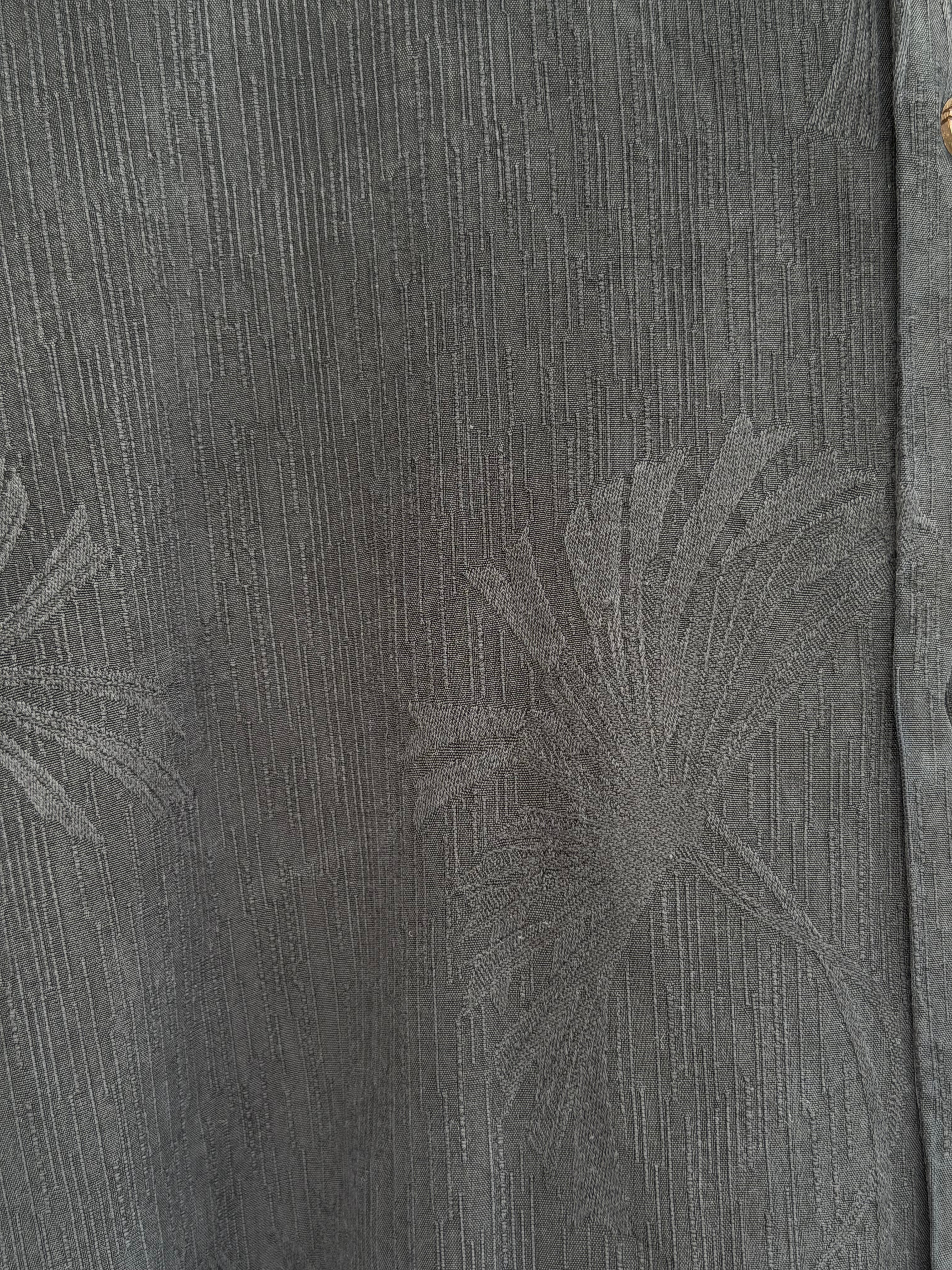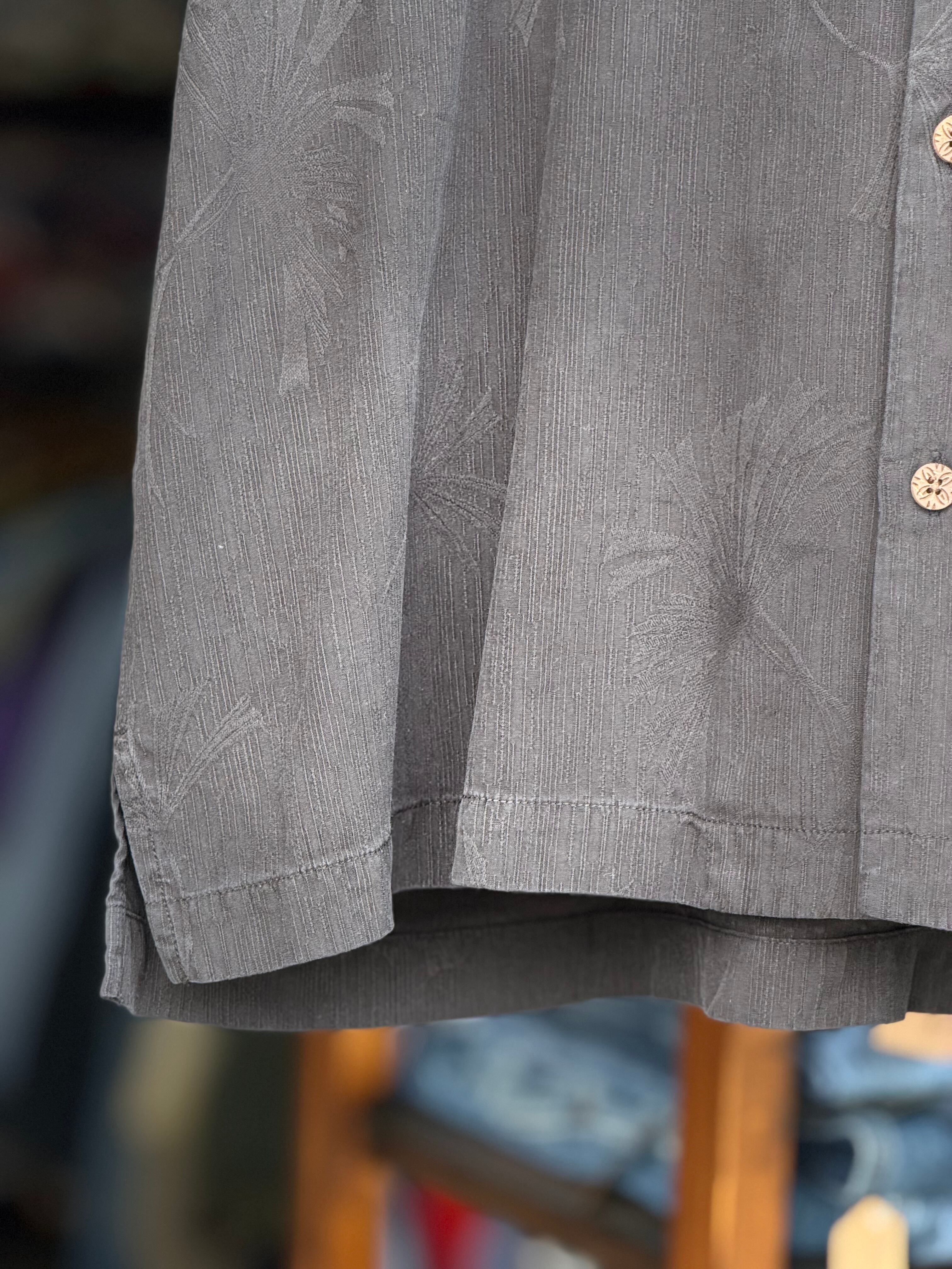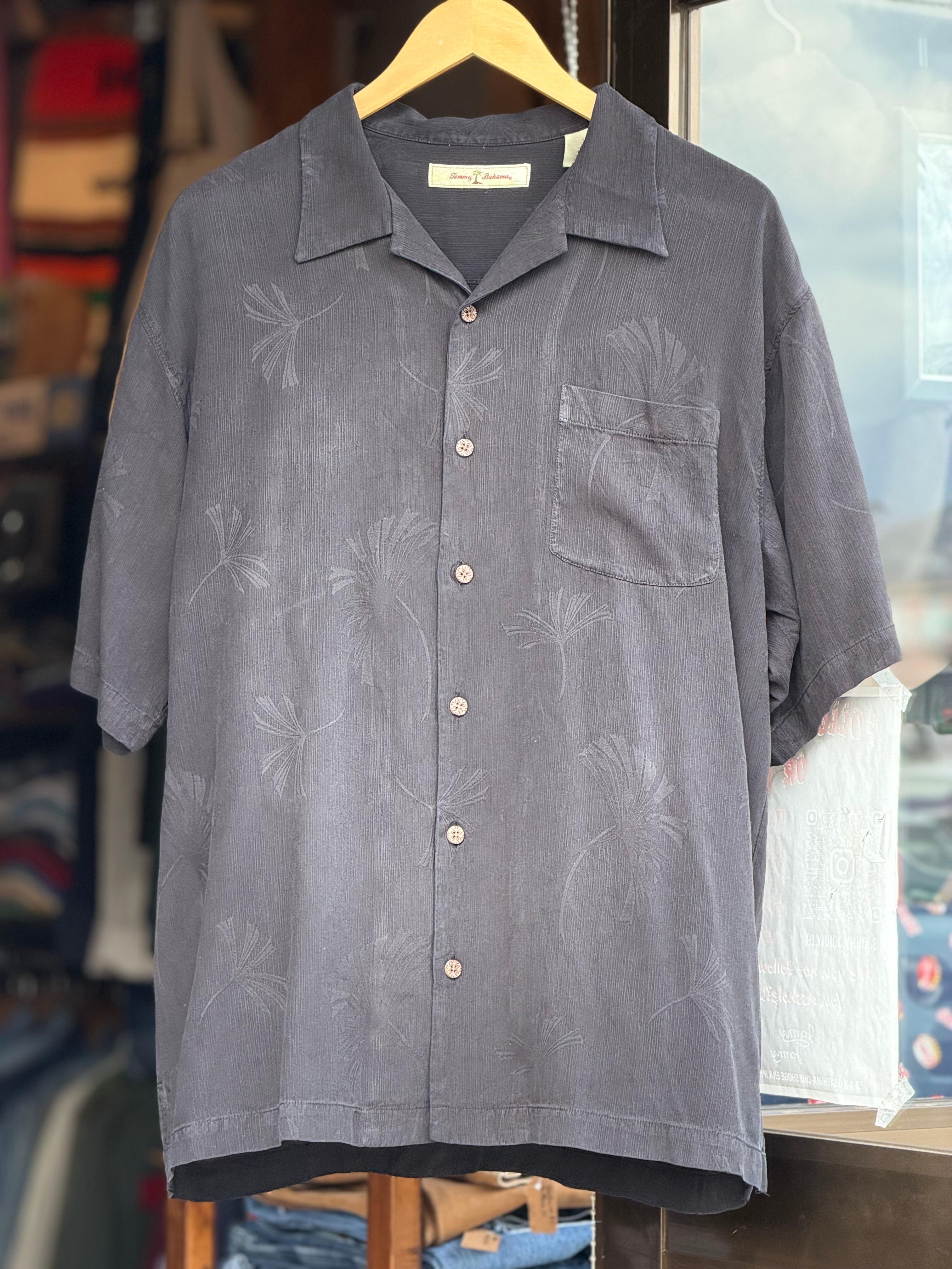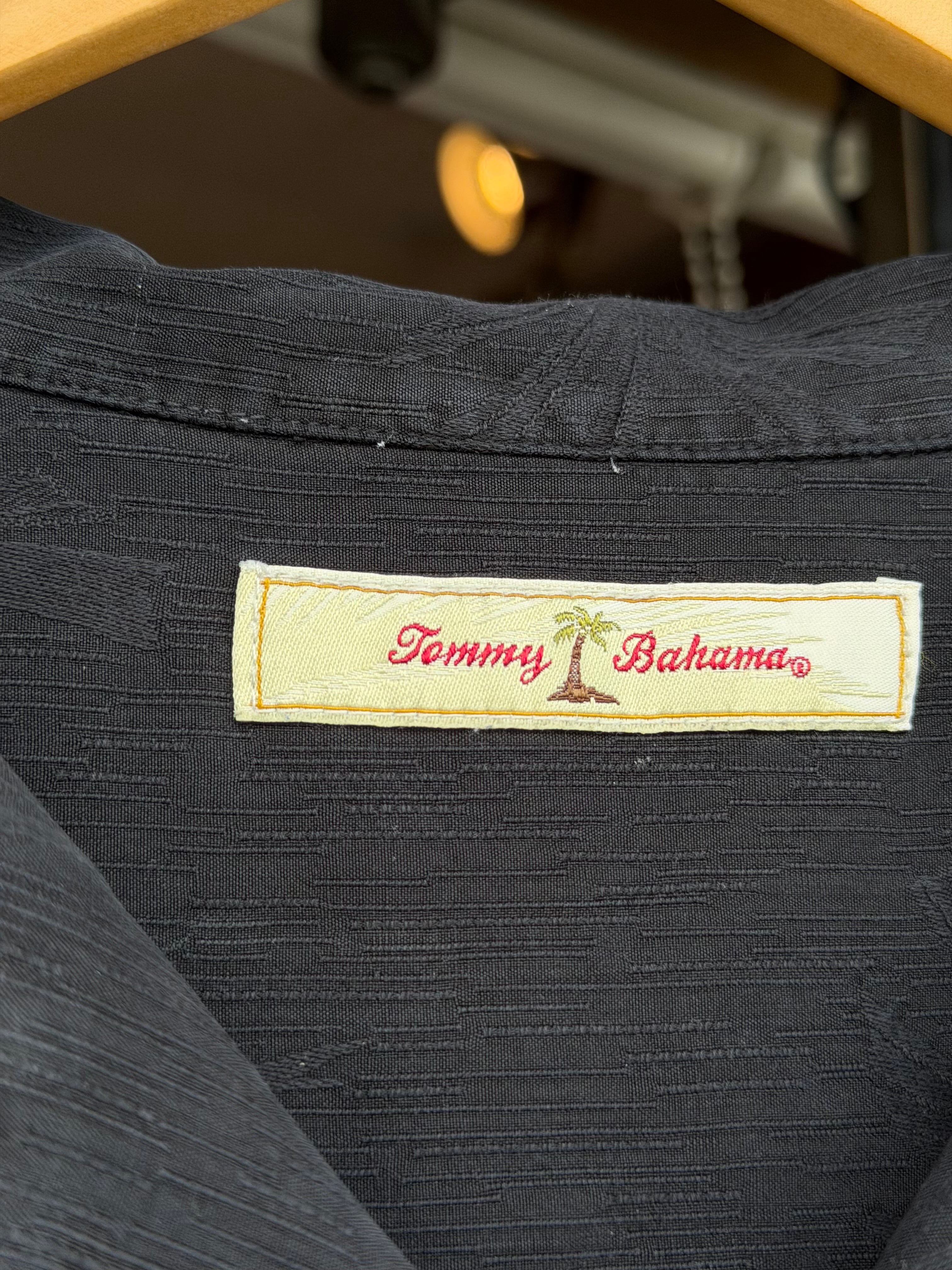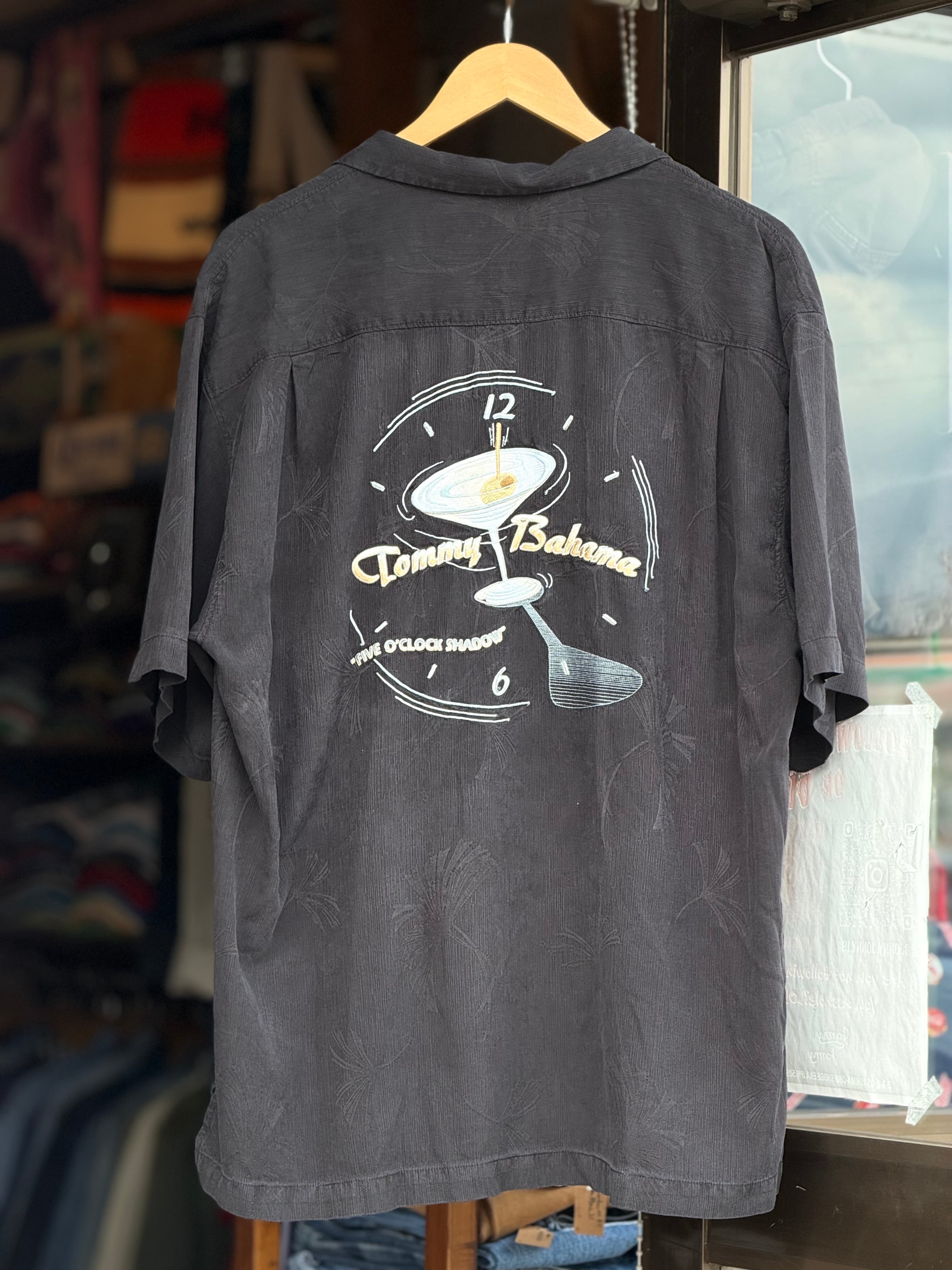Tommy Bahama "FIVE O'CLOCK SHADOW" 刺繍入りオープンカラー半袖シルクシャツ Lサイズ 総刺繍 ジャガード織 開襟シャツ オープンカラーシャツ ブラック スミクロ アロハシャツ シルク100% スーベニアシャツ カクテル 酒 アルコール スカシャツ リラックス アメカジ 古着 南国 大きいサイズ