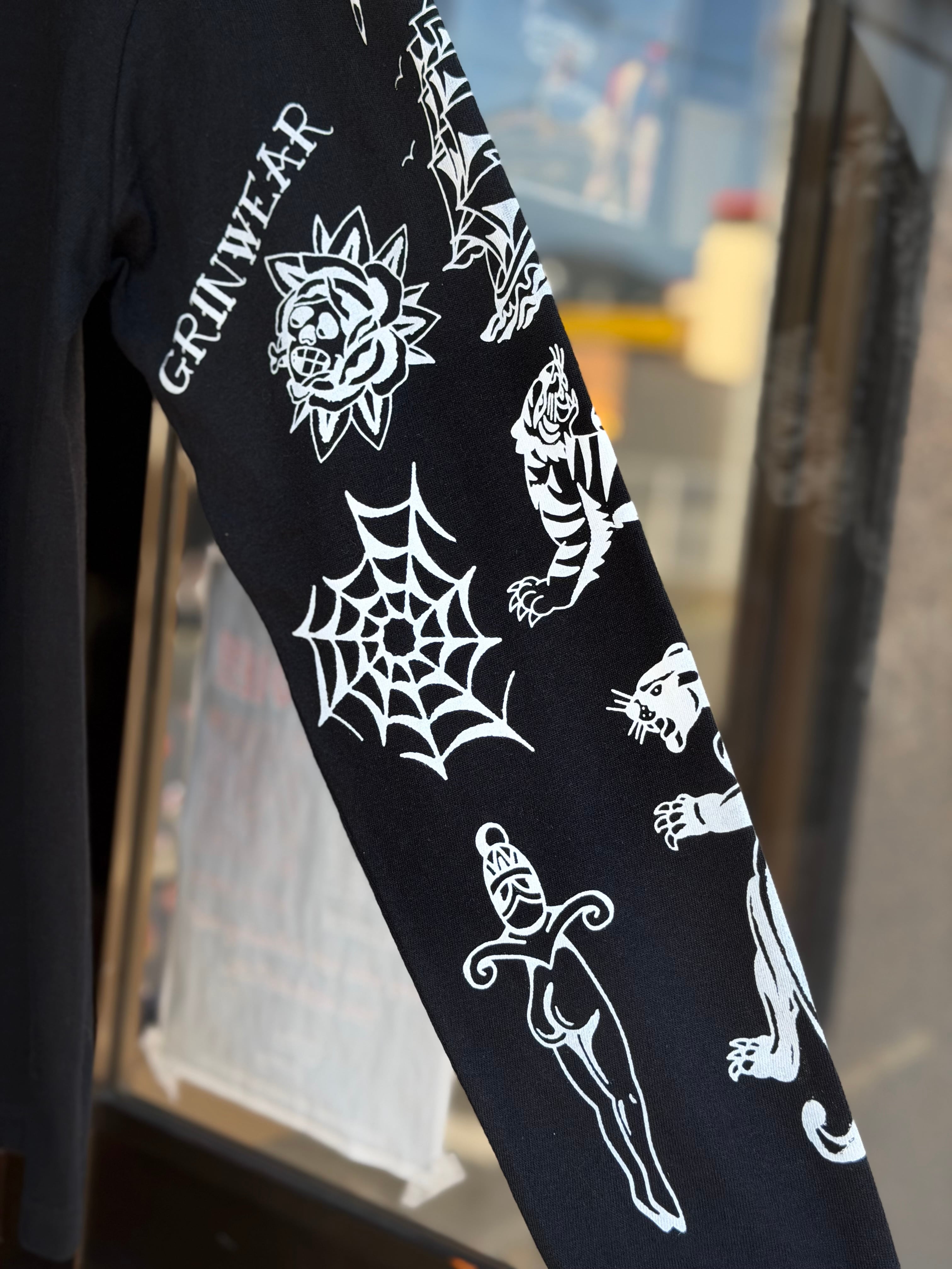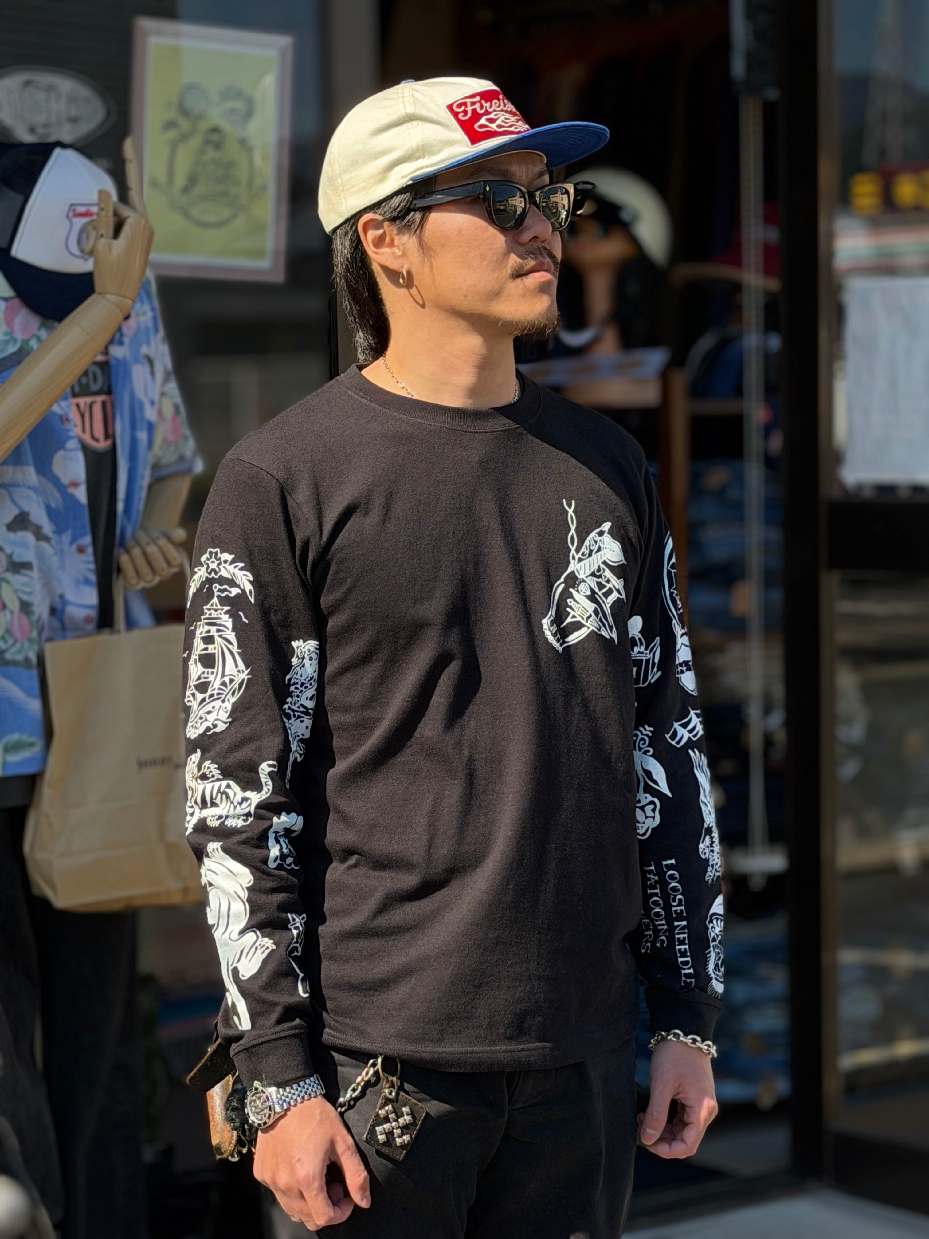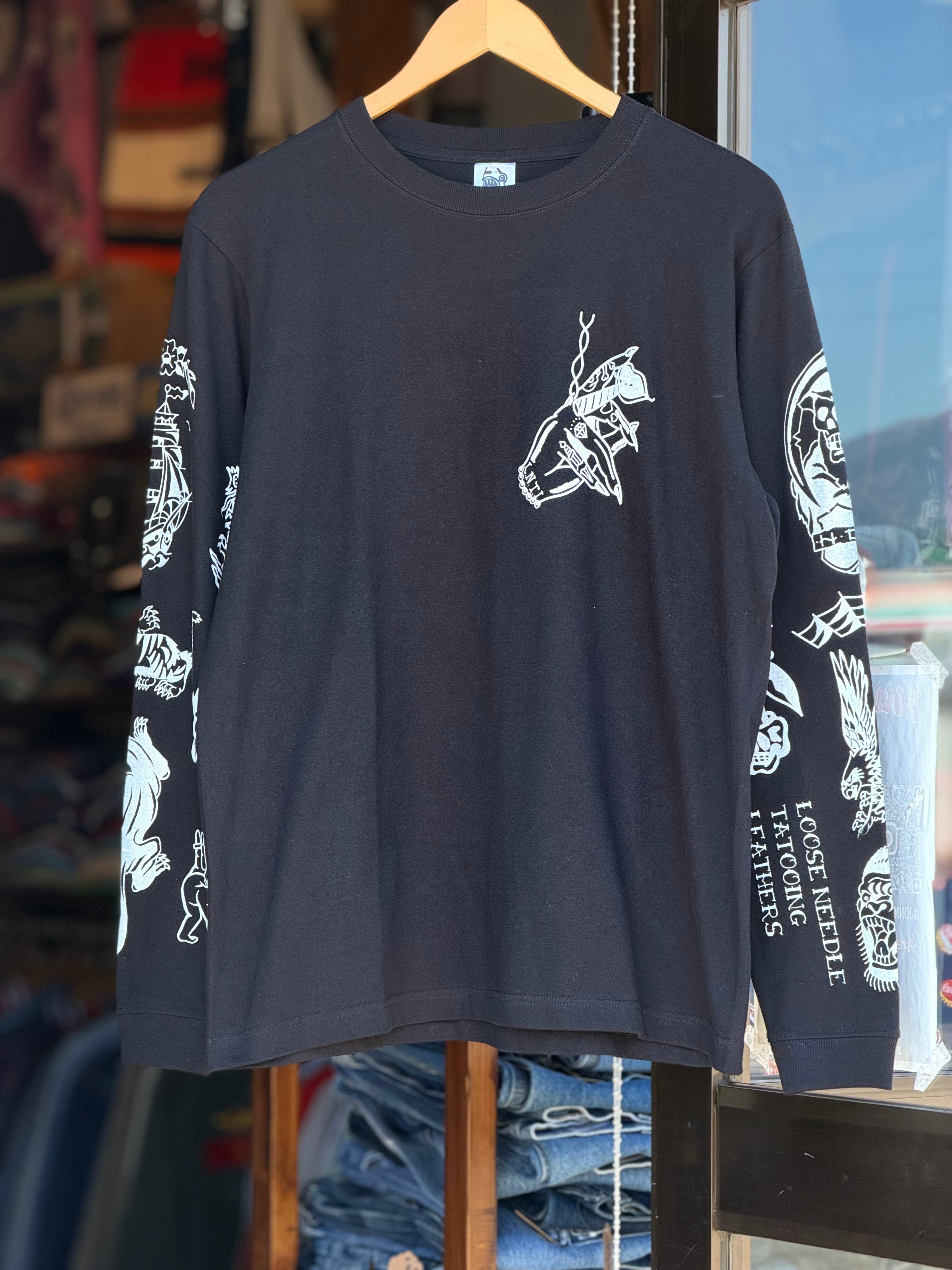 GRINWEAR×LOOSE NEEDLE TATTOOING LETHERS タトゥースリーブプリント長袖Tシャツ american traditional tattoo old school tattoo ロンT 袖プリント オールドスクールタトゥー アメリカントラディショナルタトゥー 手刷り アメカジ 新品 バイカーファッション