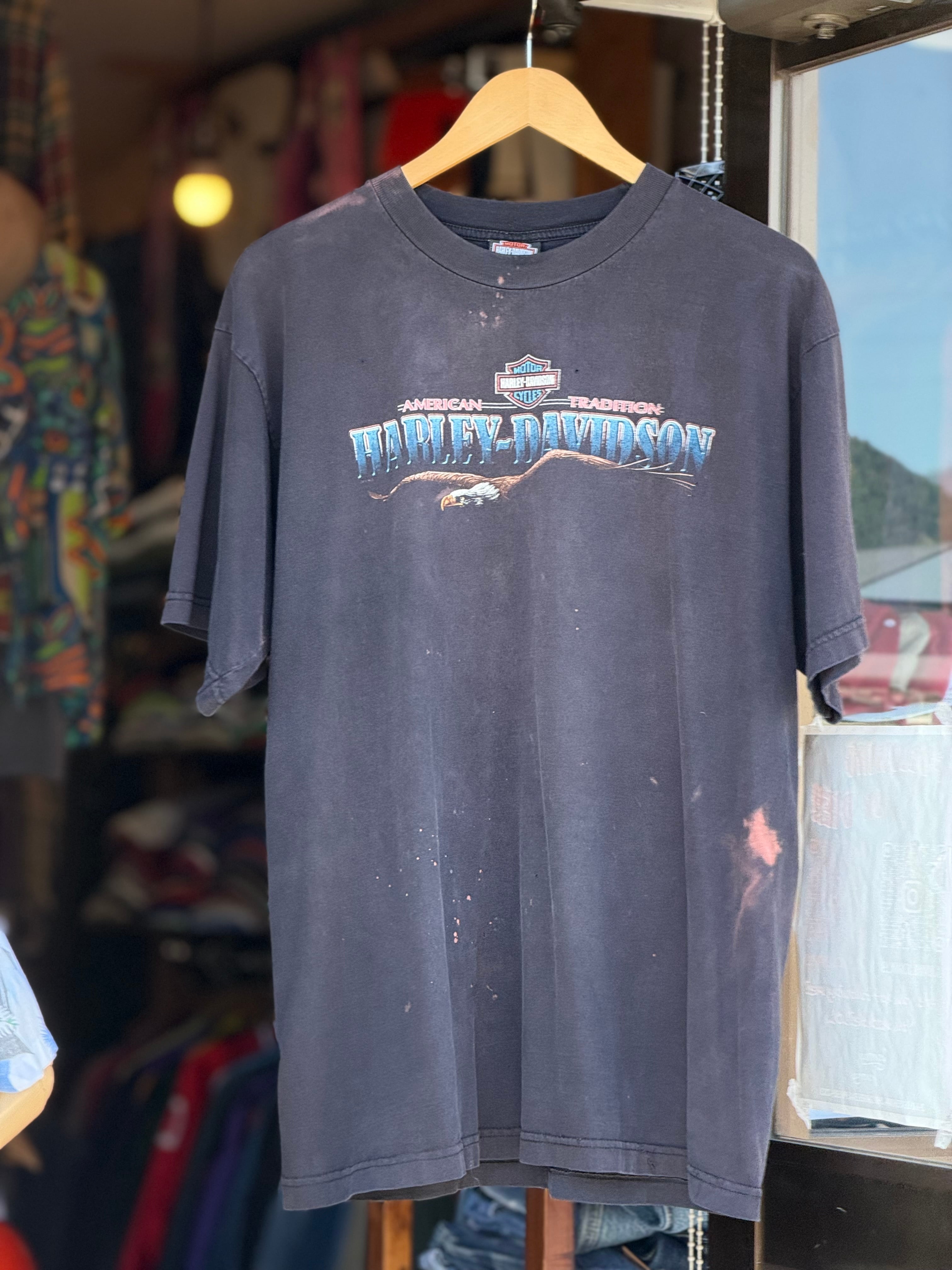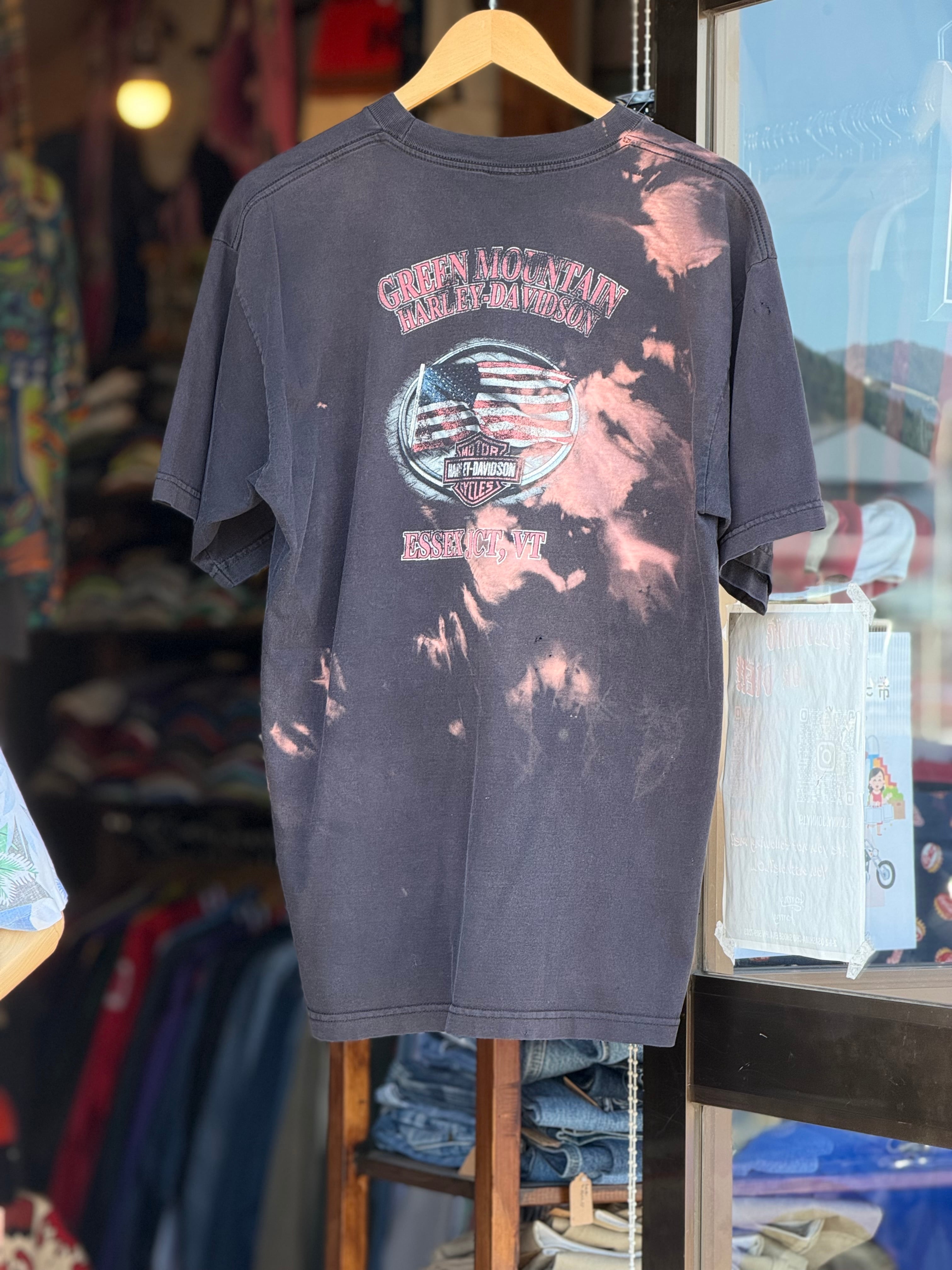 00's HARLEY-DAVIDSON "GREEN MOUNTAIN" 半袖Tシャツ "襤褸" MADE IN U.S.A. XLサイズ ハーレーTシャツ ハーレーダビッドソン ブリーチ 漂白剤 脱色 ボロ BORO アメカジ 古着 2007年 バイカーファッション イーグル