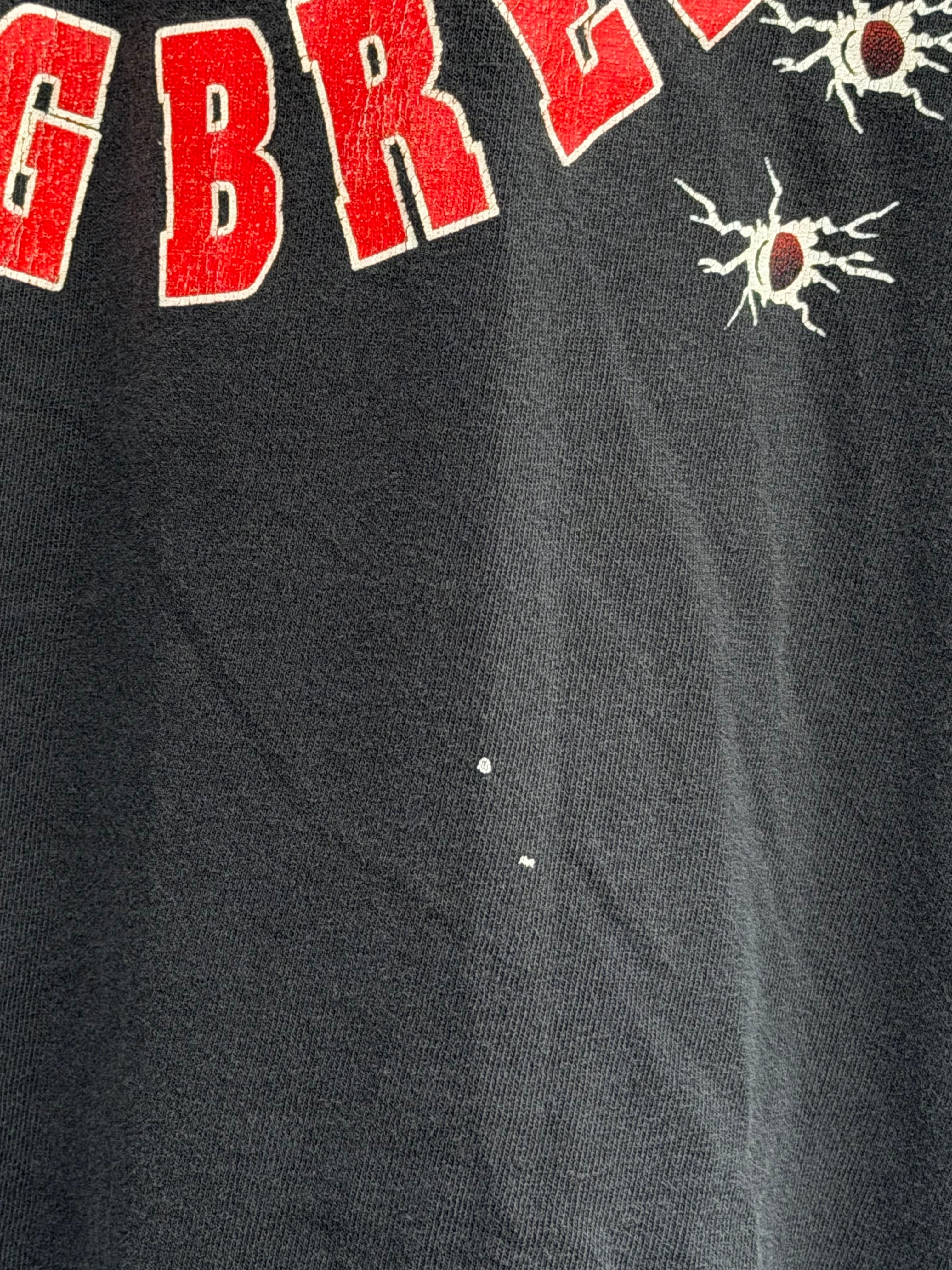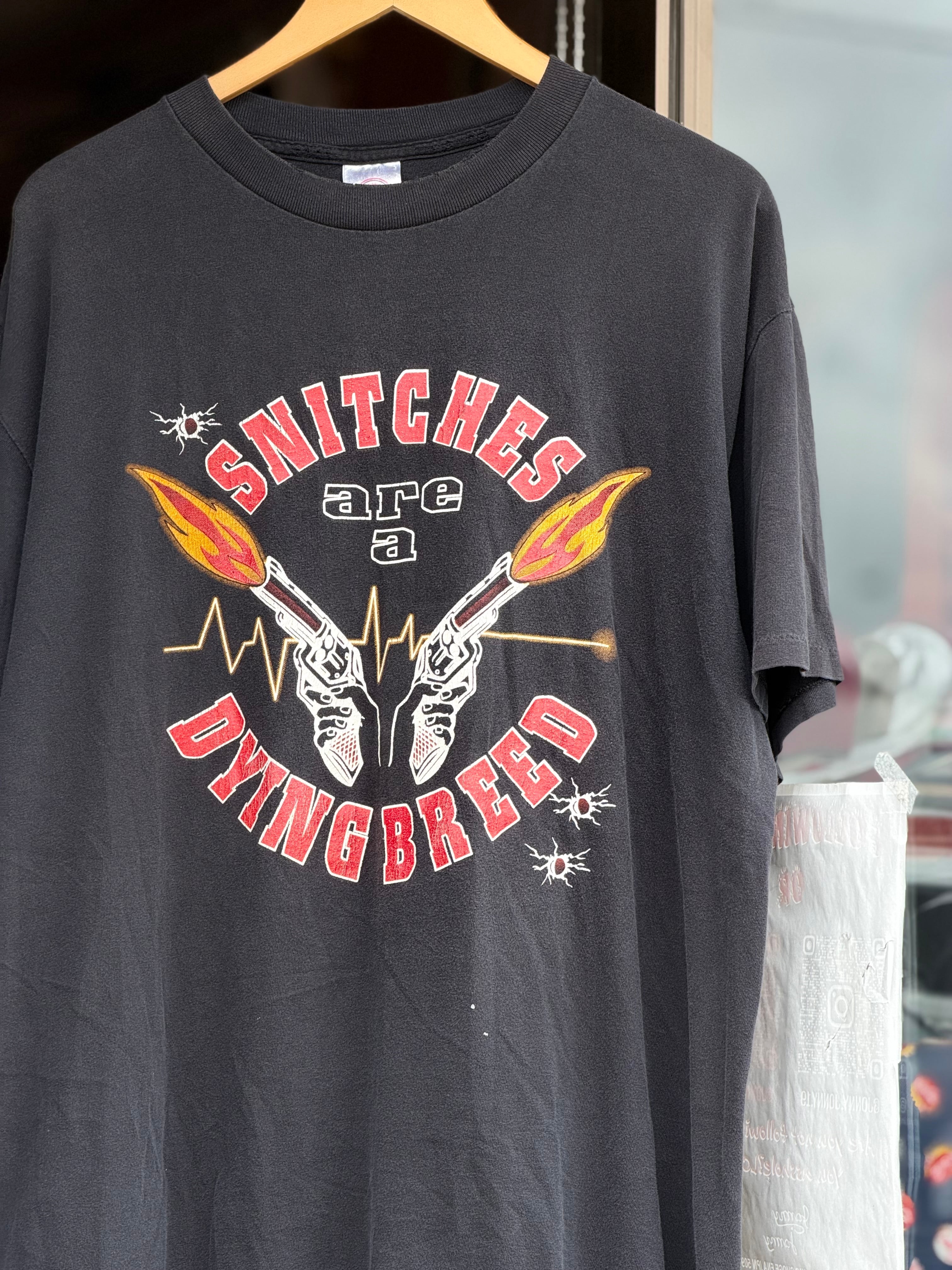 90's "SNITCHES are a DYING BREED" バイカーTシャツ MADE IN U.S.A. XLサイズ 半袖Tシャツ フェード スミクロ シングルステッチ ピストル フレイムス ファイヤーパターン 拳銃 MC バイク アメカジ 古着 OUTLAWS MC アウトローズ