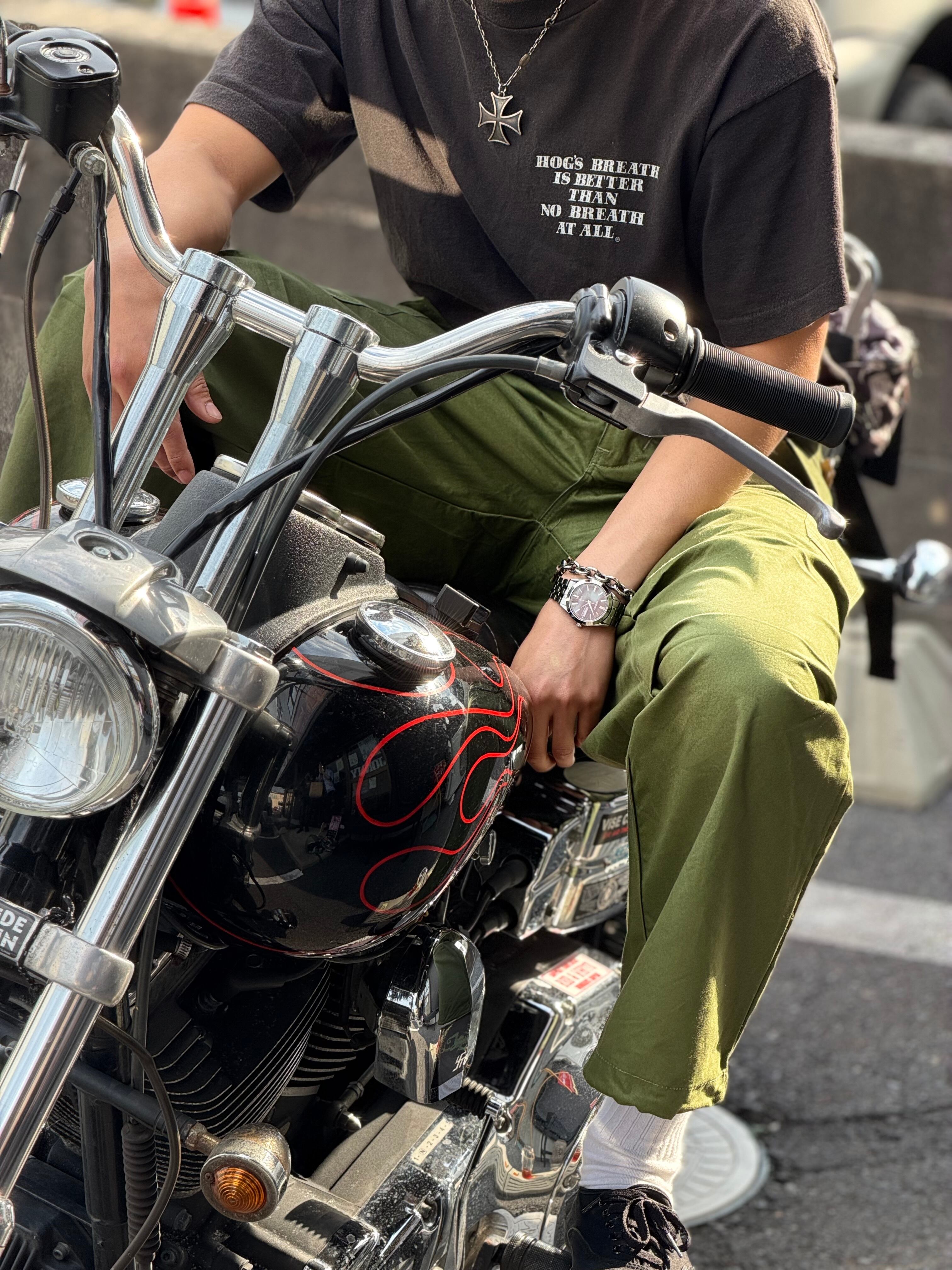 ガツンと太く、コットン100%のオリーブグリーンカラーで6ポケット。