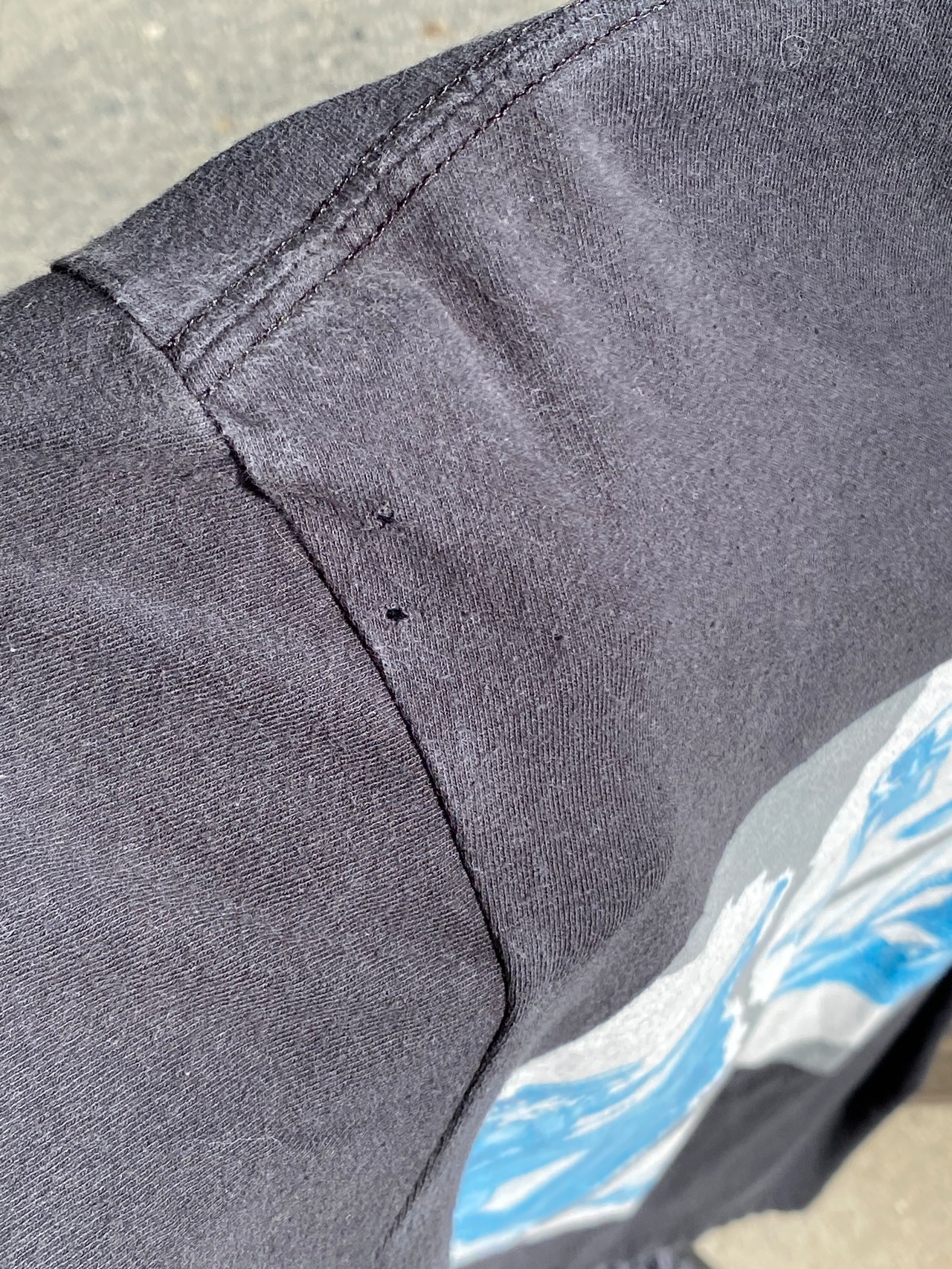 サイズはややタイト目なMサイズで、右肩前面にピンホールが2つほどありますが着用には支障の無いレベルです。