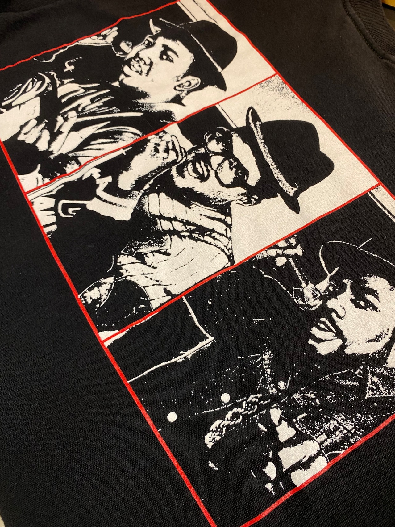 フロントには数多のサンプリングを受けた有名なロゴが大きく入り、バックにはメンバー3人の顔がプリントされています。