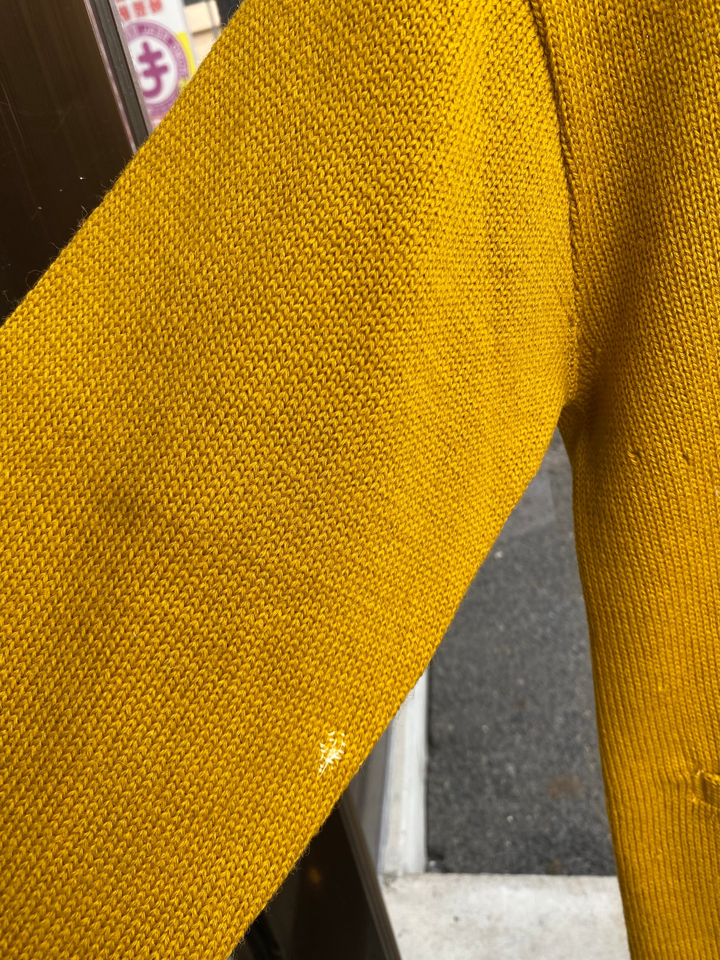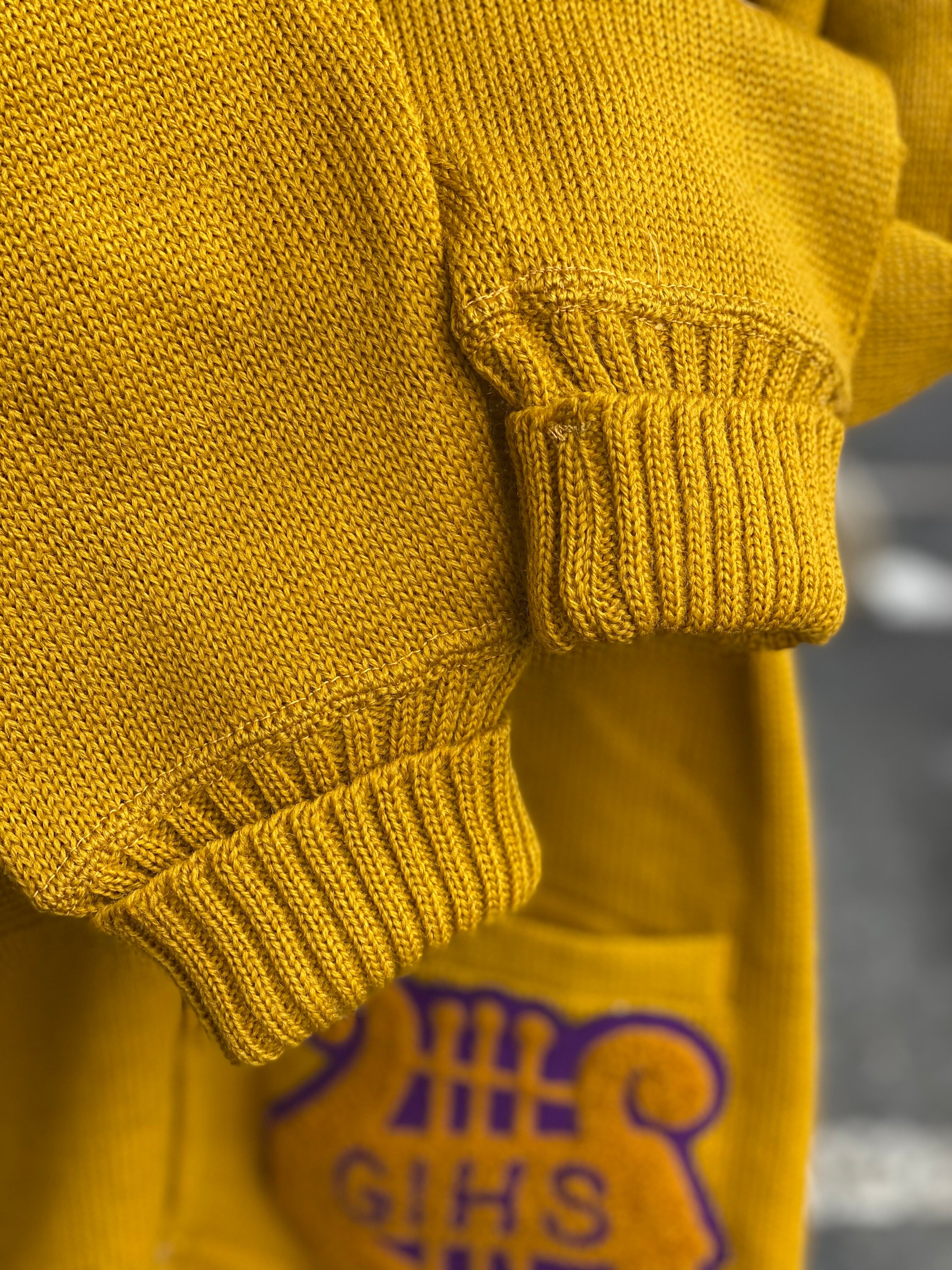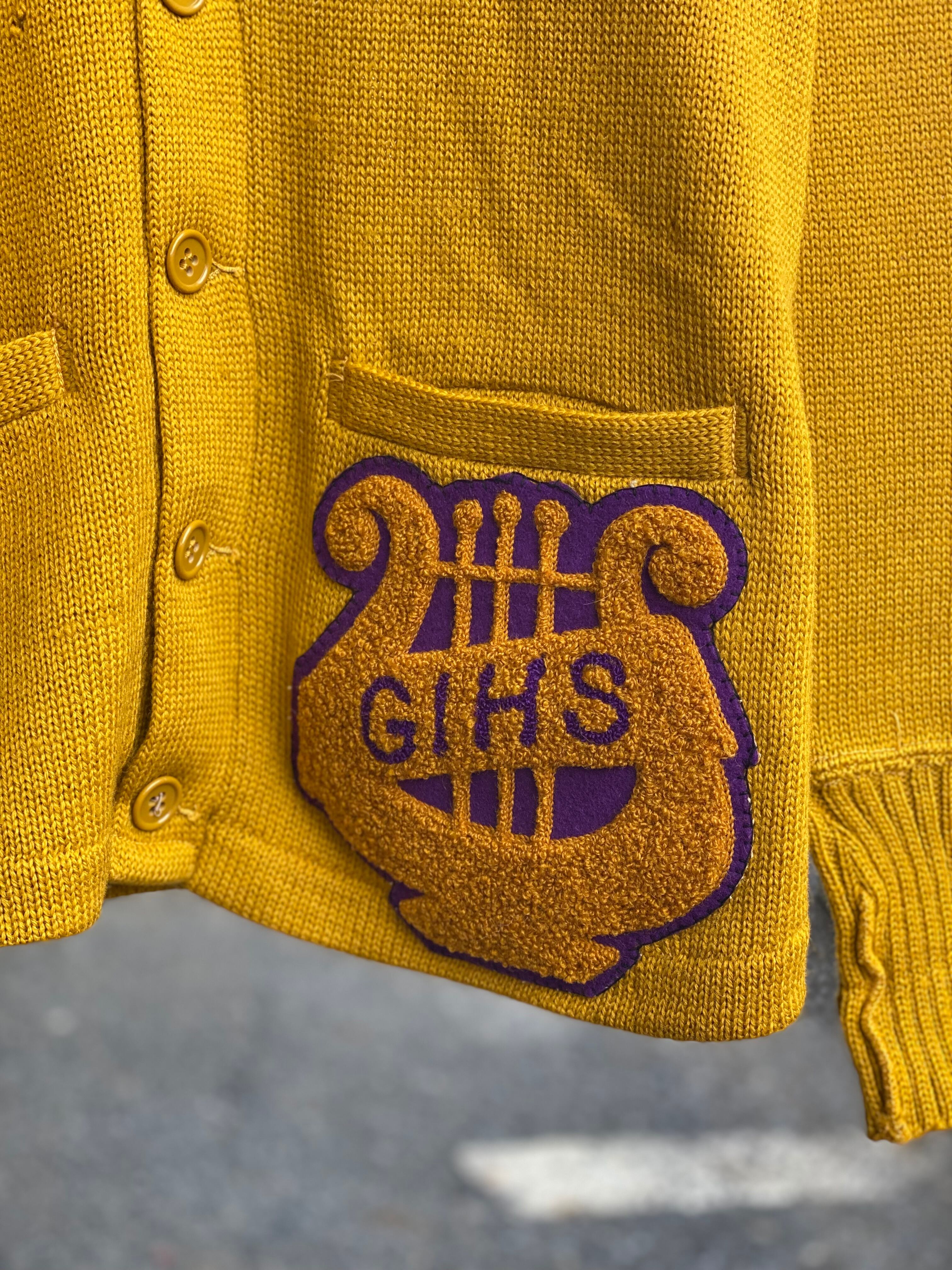無地のマスタードイエローボディにイエロー×パープルの"GIHS"とデザインされたシニールワッペンが縫い付けられています。恐らくどこかのハイスクールのもので、そこの生徒が着ていたものかと思われます。