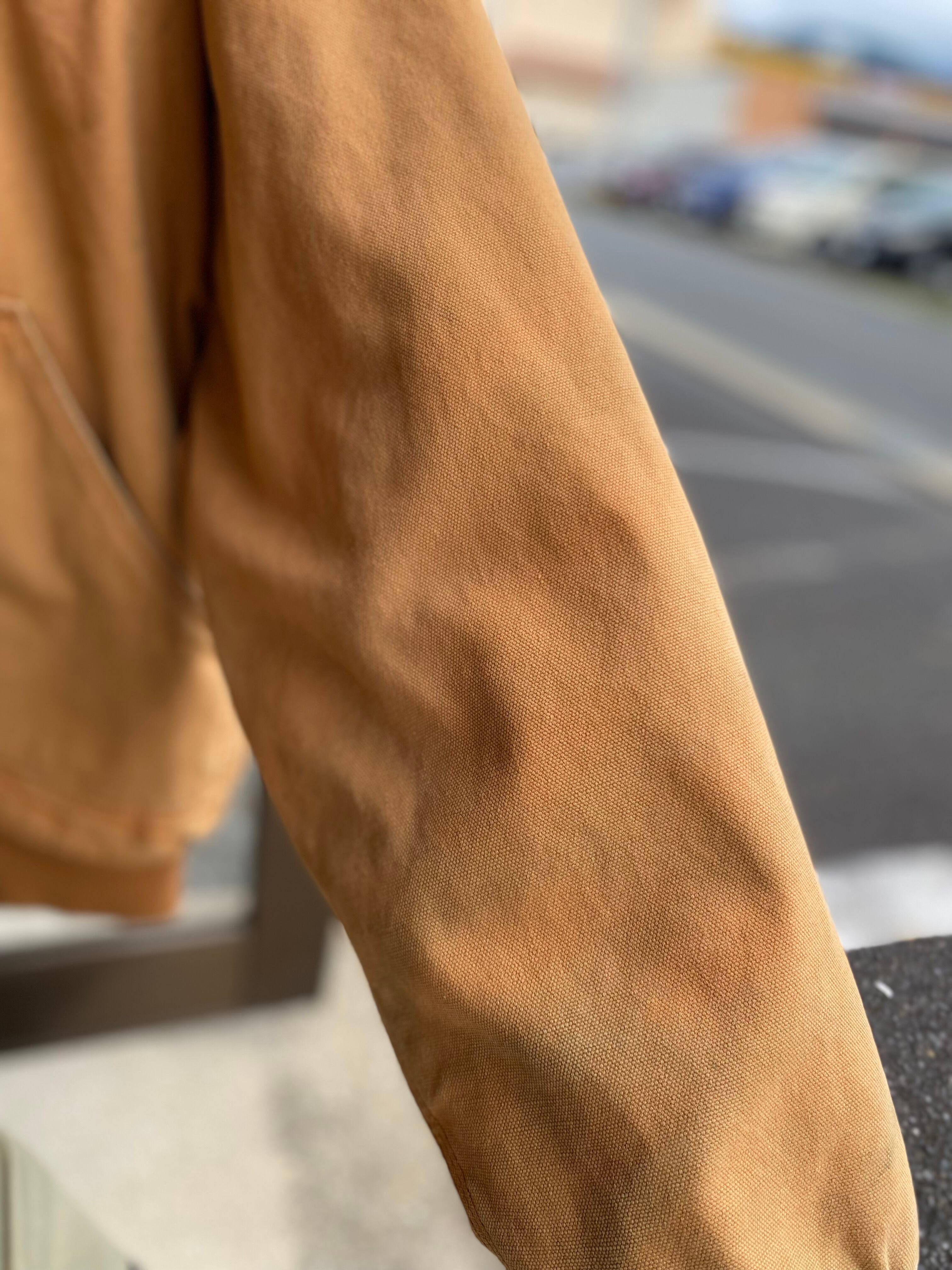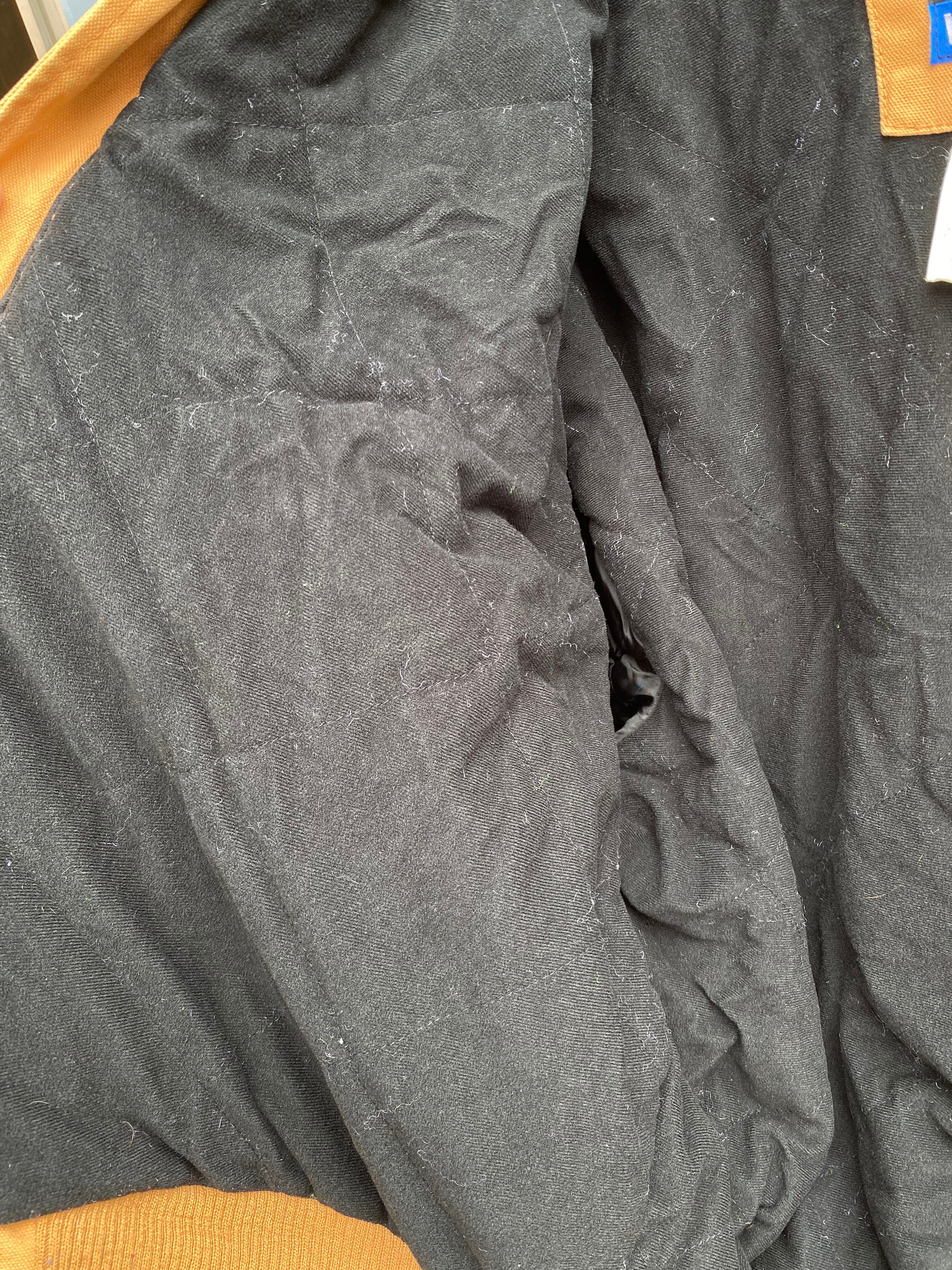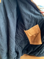 表地はブラウンダックで、裏地はブラックのキルティングライナーになっており保温性も抜群。