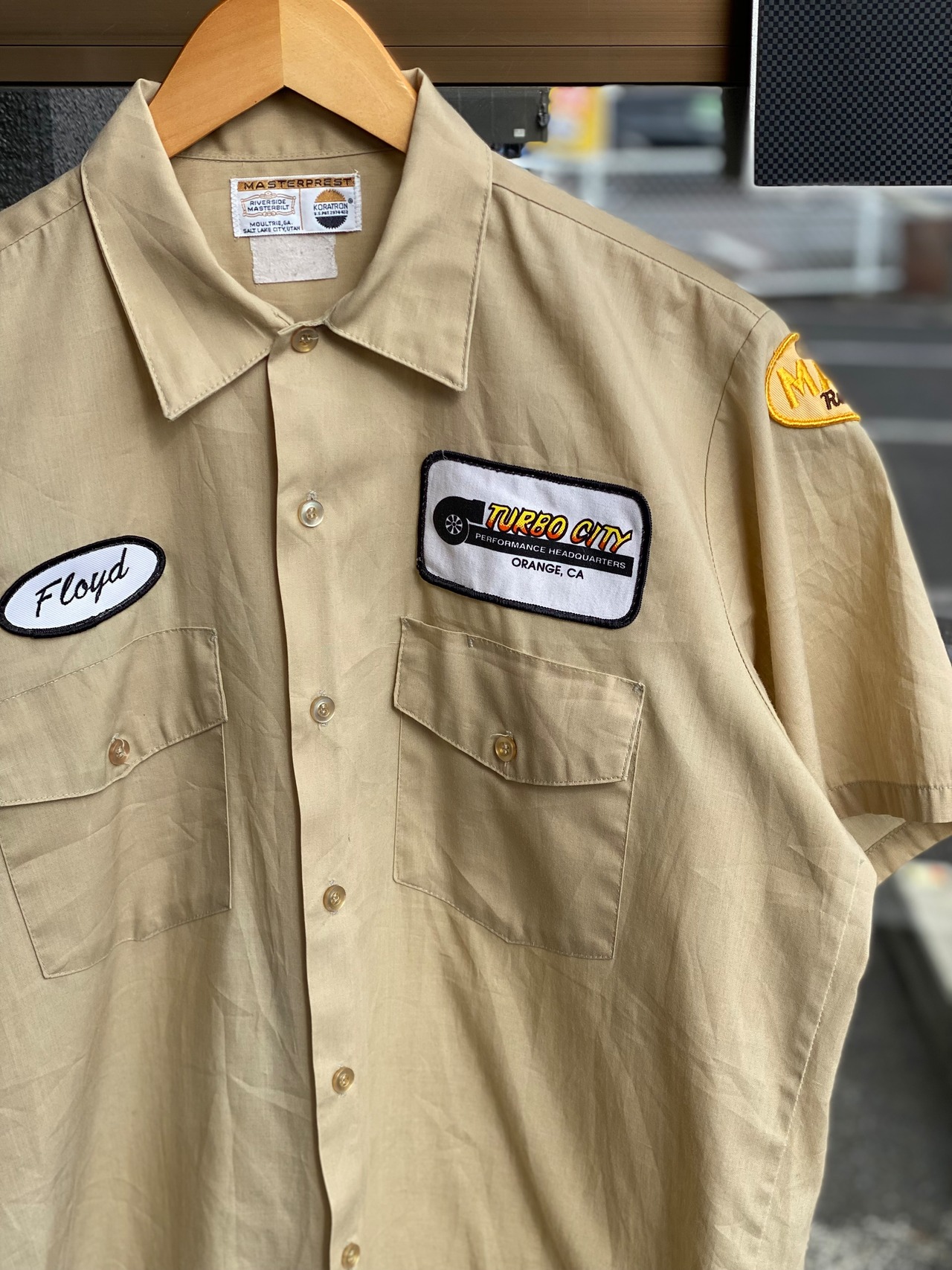 カラーは定番カラーのカーキ(ベージュ)で、左胸に付けられたTURBO CITYのワッペンが特徴的です。
