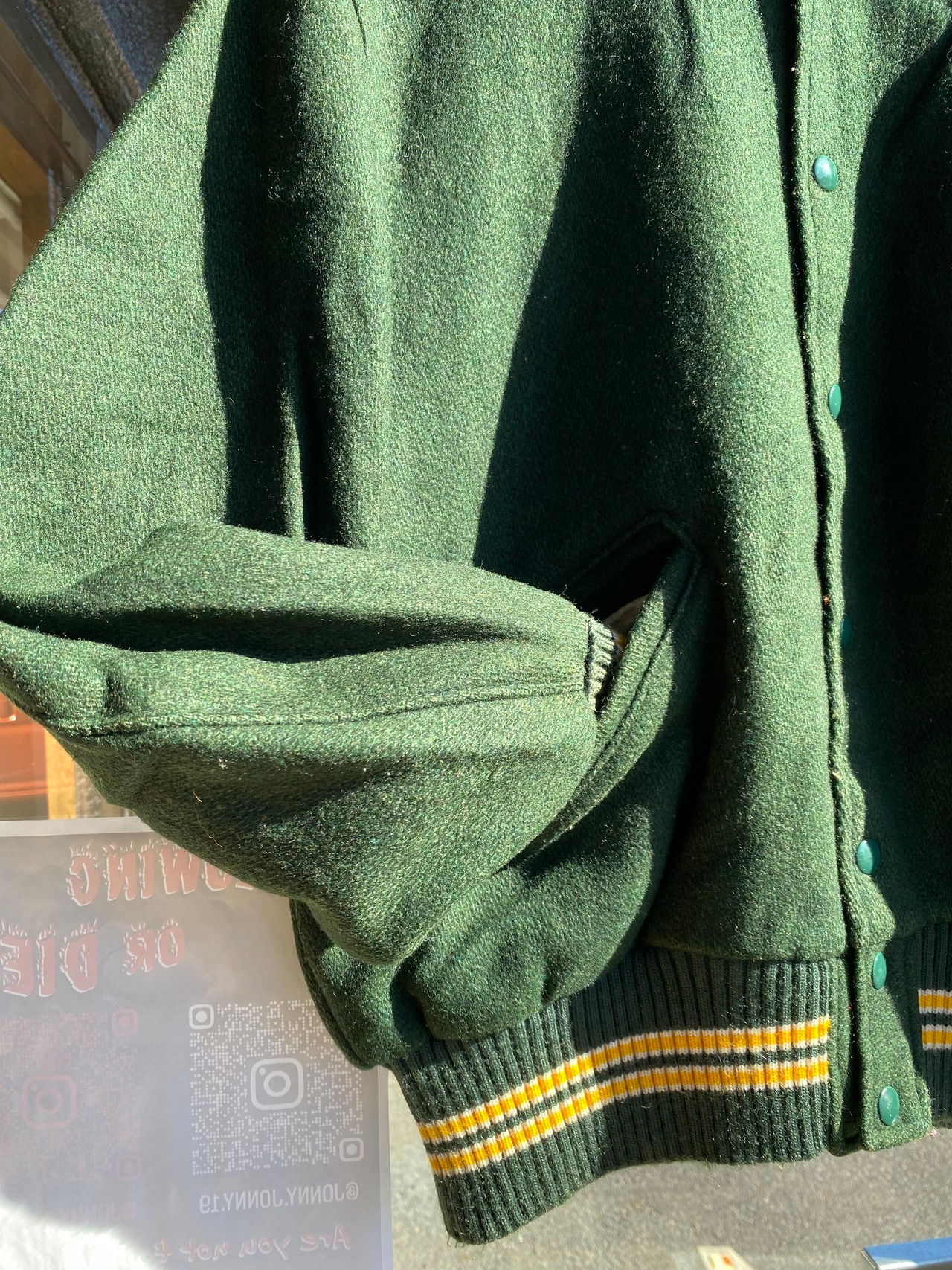 ボディ、袖部分共に深いダークグリーンカラーのウール素材で各リブにイエローのラインがアクセントで入ります。