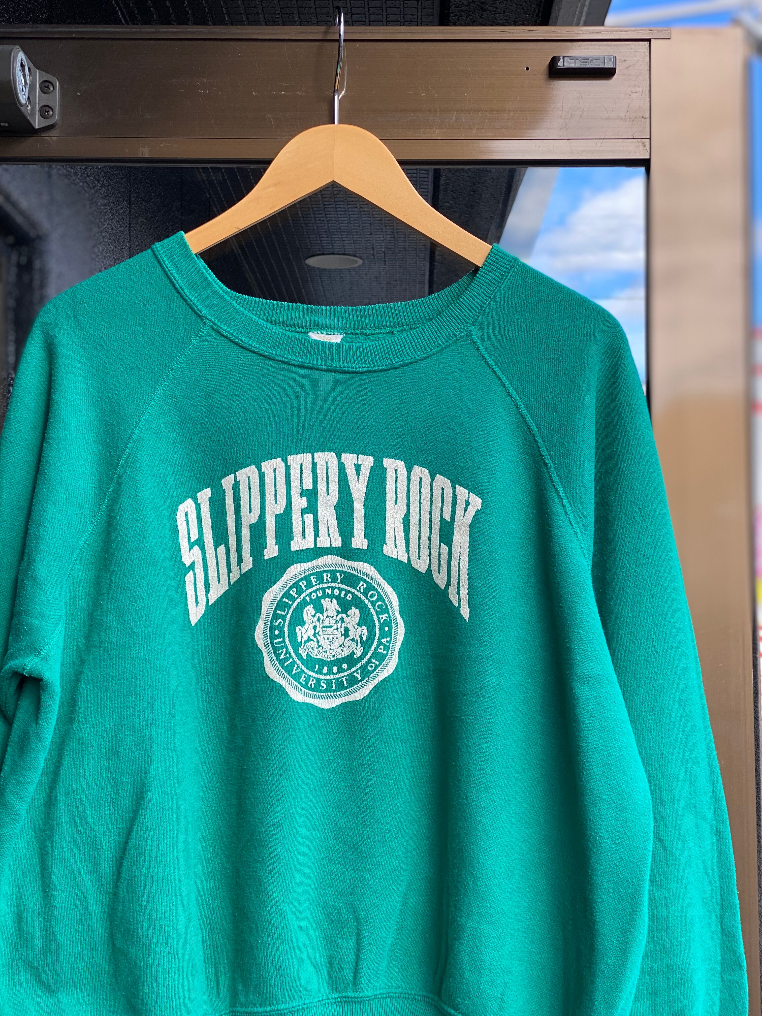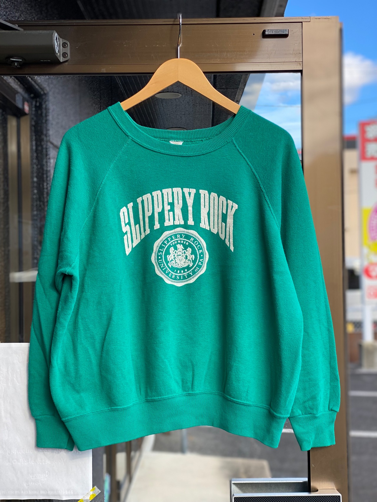 ペンシルバニア州立スリッパリーロック大学のモノのようで、THEカレッジモノといった定番のデザインです。