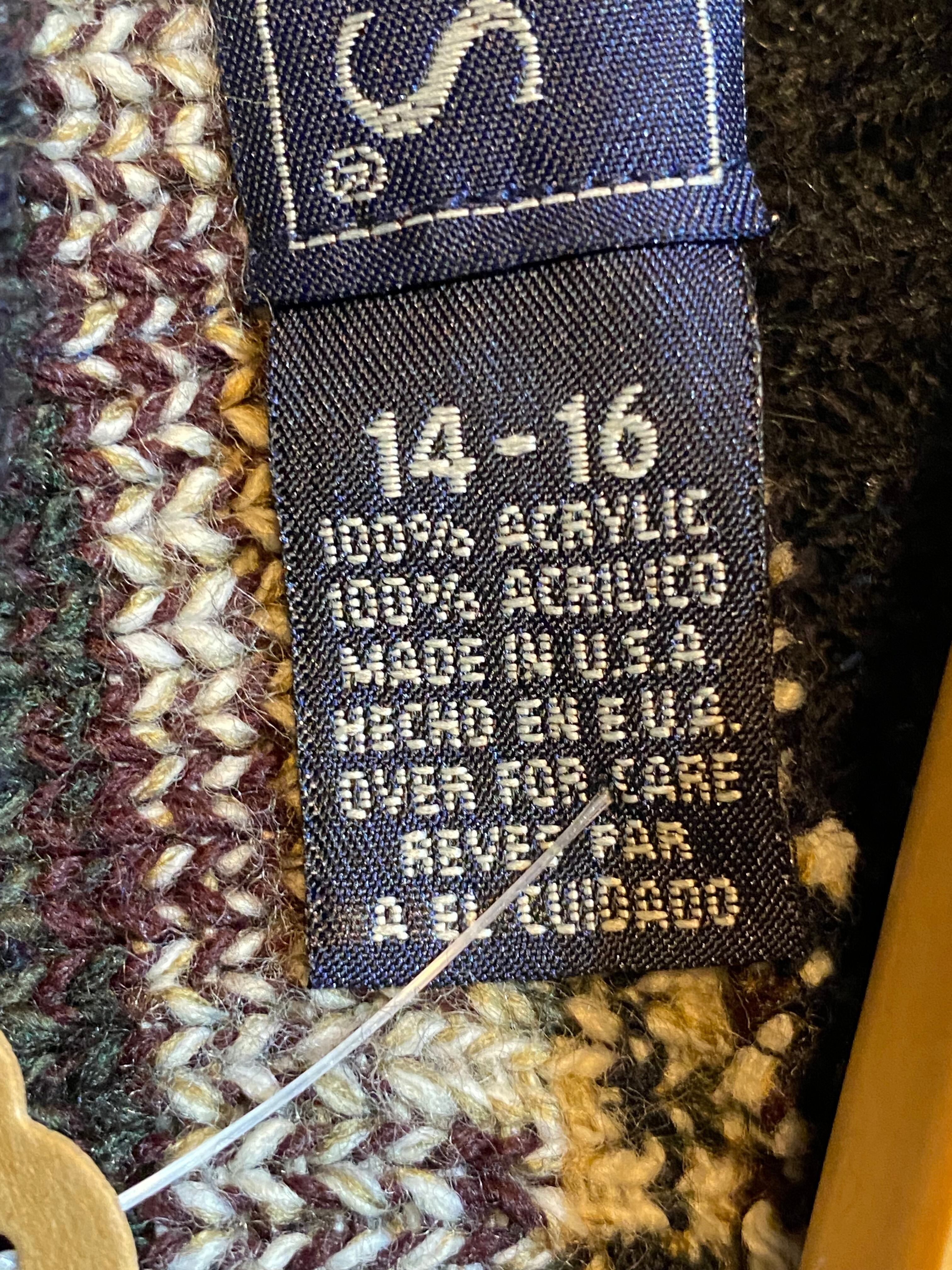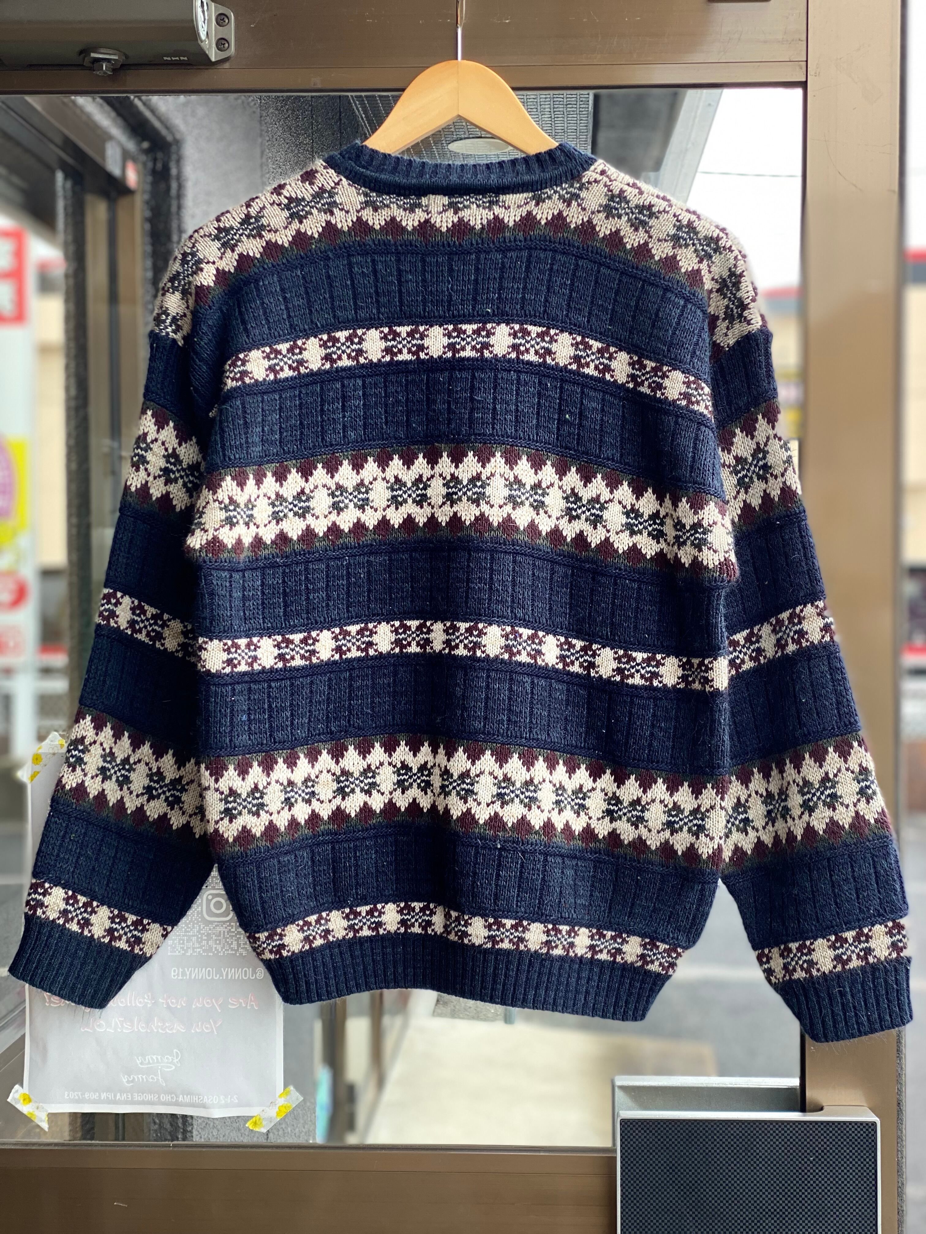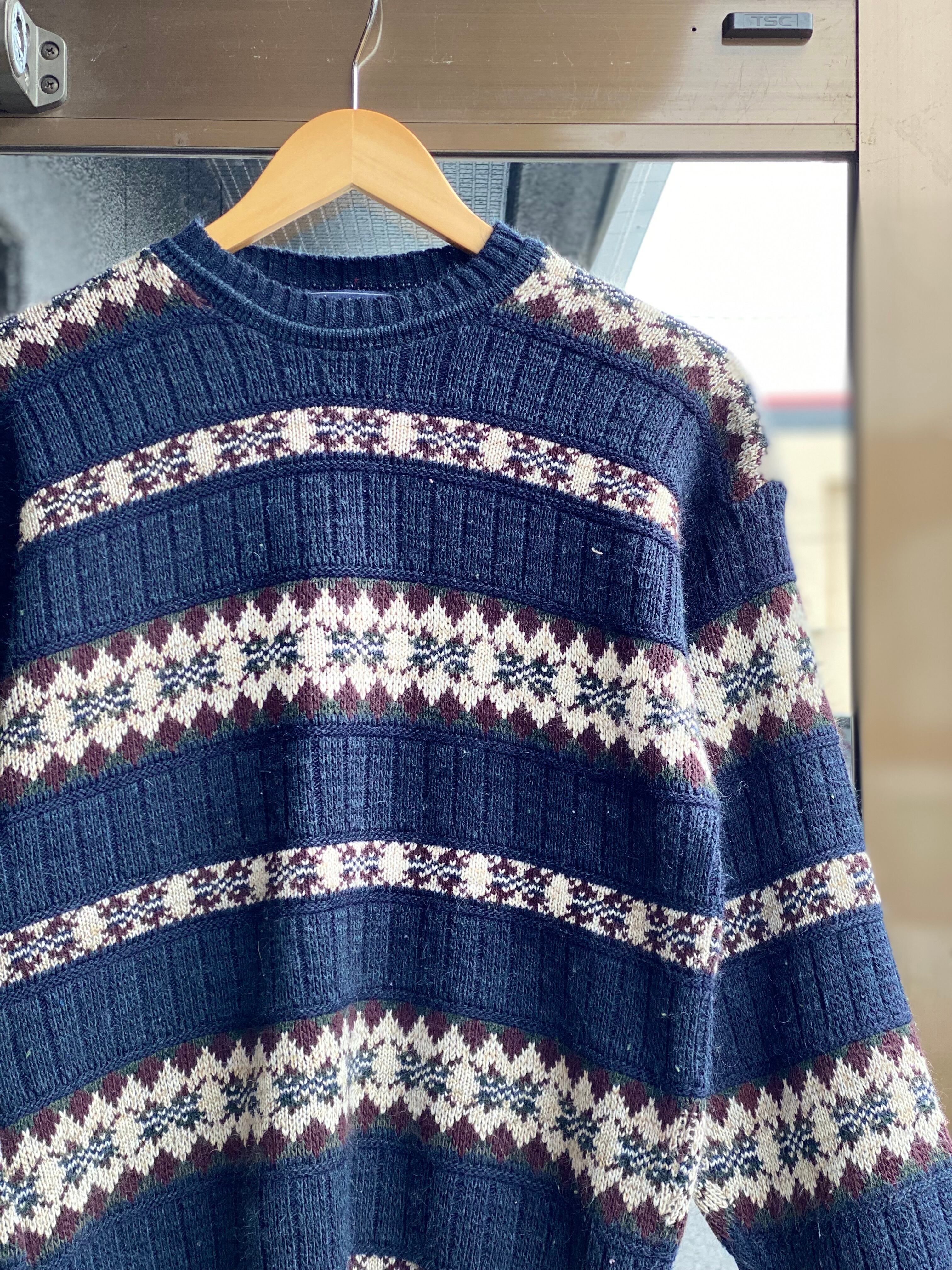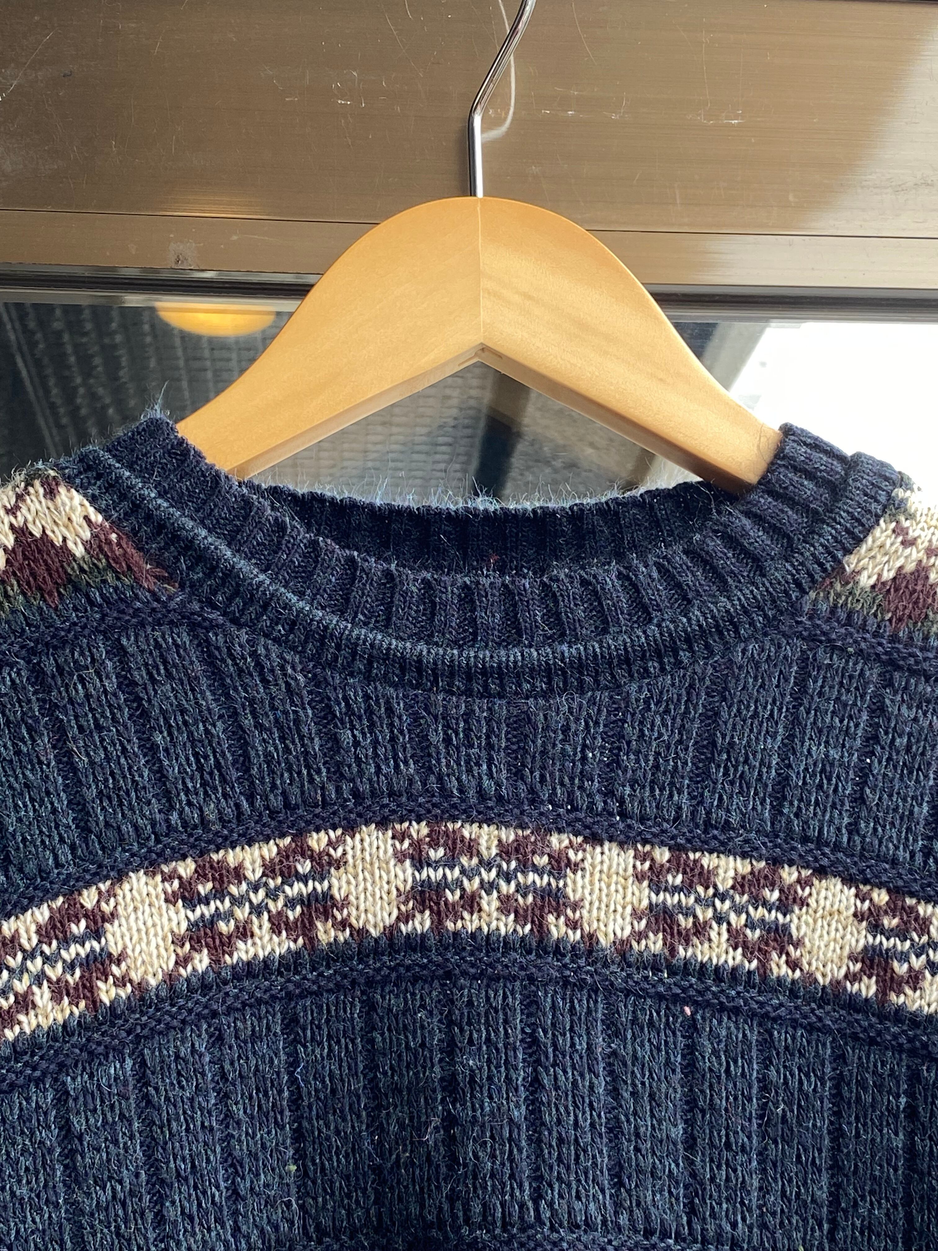 90's basic EDITIONS 総柄アクリルニットセーター 14-16 キッズLサイズ メンズS〜Mサイズ程 ダークネイビー ノルディック ボーダー アメリカ製 MADE IN U.S.A.