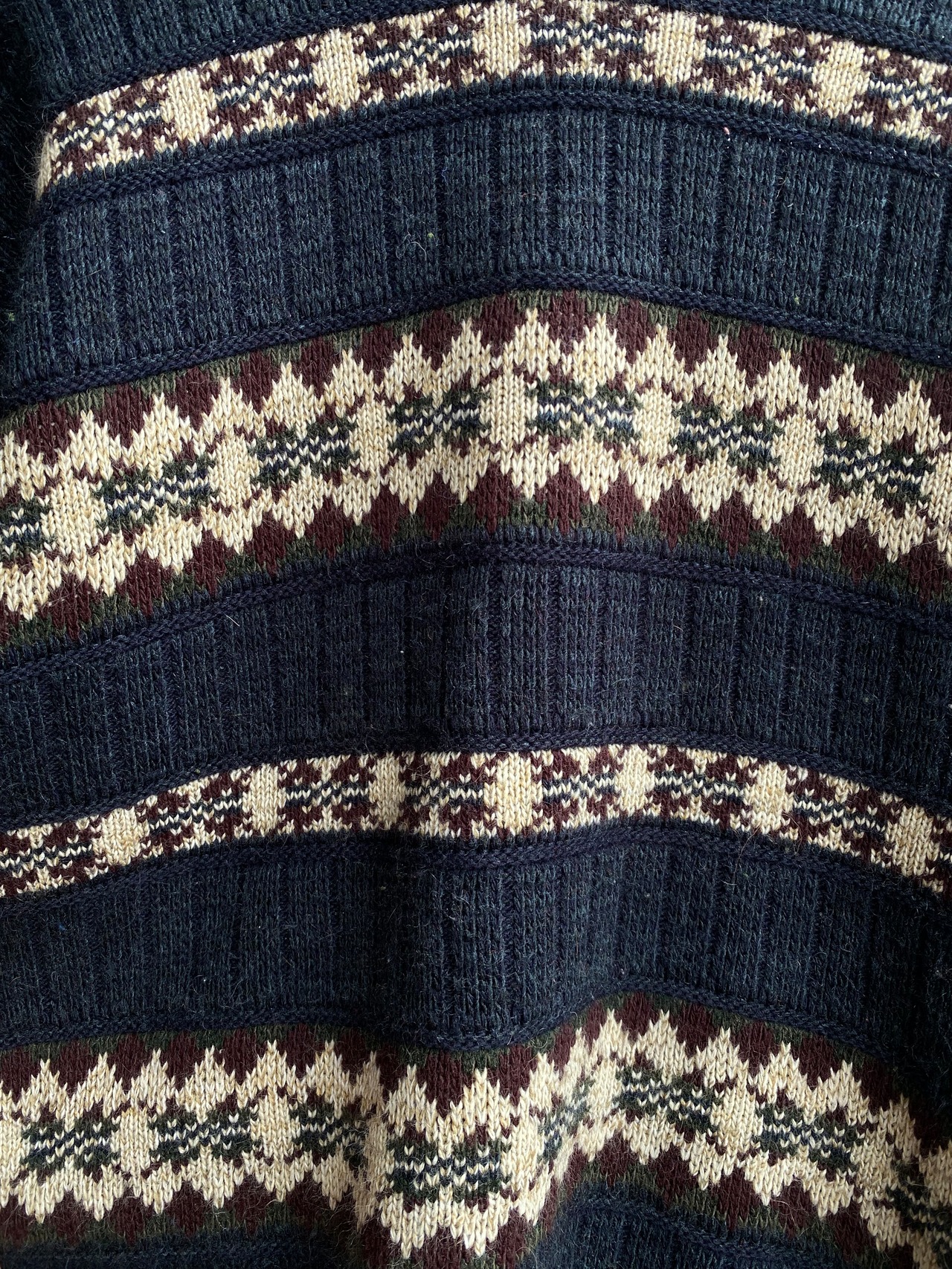 ノルディック柄のようでそうでない、ダークネイビーがベースになったボーダー柄になります。