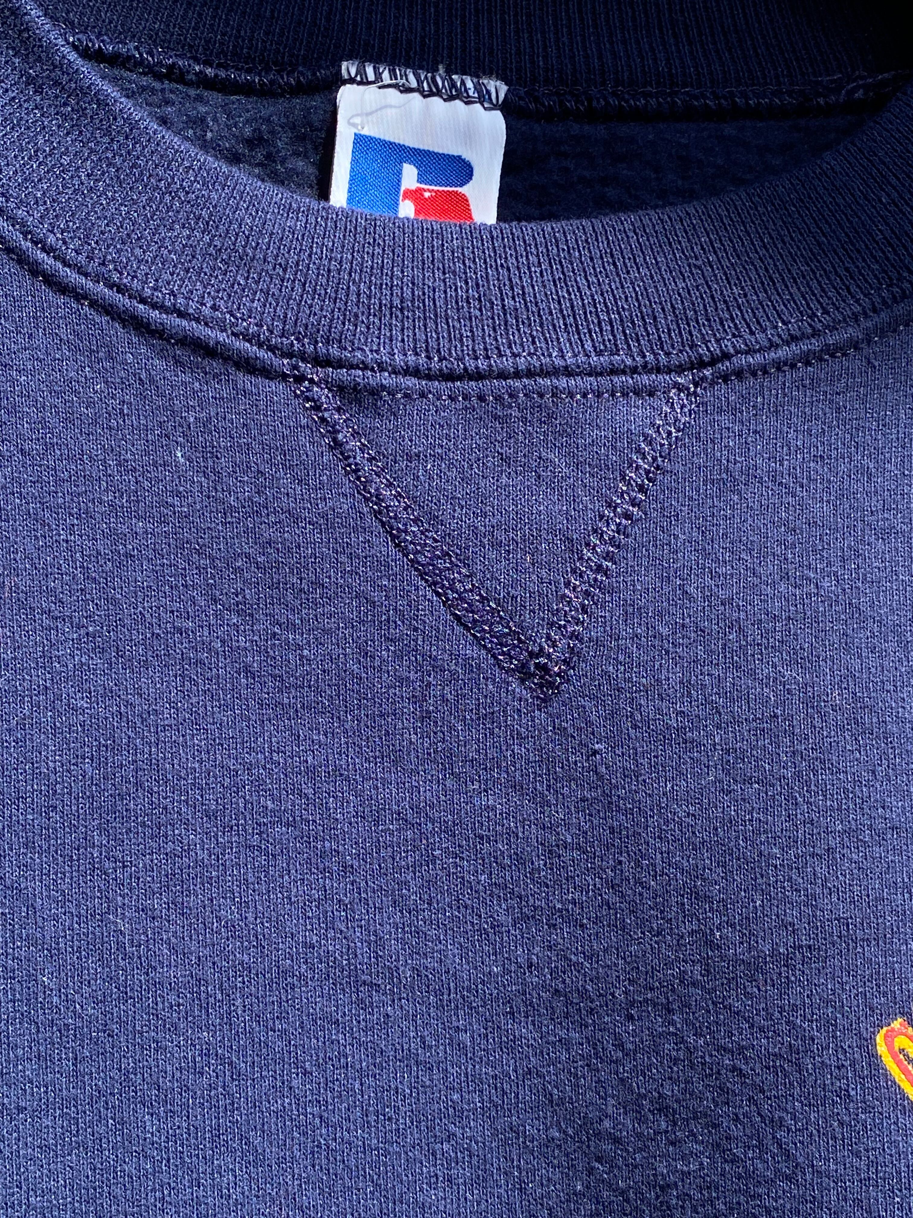 90's RUSSEL ATHLETIC 前Vガゼットスウェットシャツ Lサイズ アメリカ製 MADE IN U.S.A. ラッセルアスレチック ダークネイビー ワンポイント シンプル 無地 短丈 ボックスシルエット トレーナー