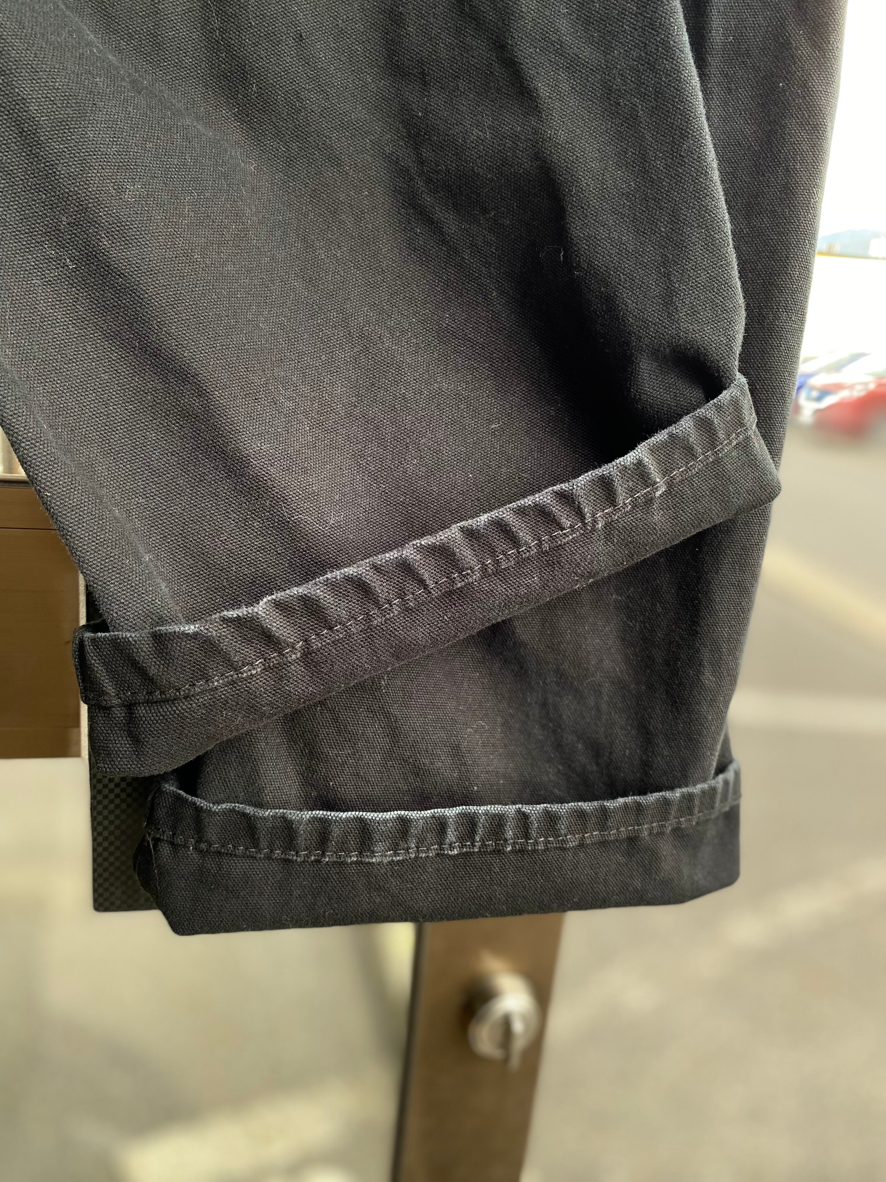 所謂ペインターパンツのディティールが盛り込まれ、コットン100%のキャンバスダック地を使用しており、左後ポケットのハンマーループは省略されています。